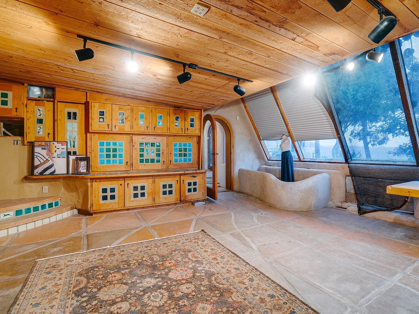 This distinctive living area features an inviting layout with natural light pouring in through large, slanted windows. The warm tones of the wooden cabinetry complement the earthy stone floor, enhancing the cozy atmosphere. Intricate stained glass accents provide pops of color, creating visual interest against the backdrop of natural materials. The built-in seating area encourages family gatherings, while the open design fosters a sense of togetherness. A beautiful area rug adds softness to the space, inviting relaxation. Architectural curves and playful angles highlight the home’s innovative design, making it an inspiring choice for future homeowners.