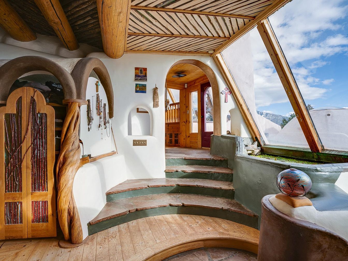The entrance hall reveals a captivating blend of organic and artistic design, with sweeping wooden beams accentuating the ceiling and gracefully arched structures inviting exploration. Curved steps lead upward to a warm wooden door, while a unique spiral column adds a touch of whimsy. A color palette of earth tones harmonizes with ambient light streaming through expansive windows, creating a welcoming atmosphere. This space integrates family-friendly features, including an array of art display points and comfortable seating nooks. Natural materials dominate, with smooth stone and hardwood flooring fostering a serene connection to the surrounding outdoor scenery.