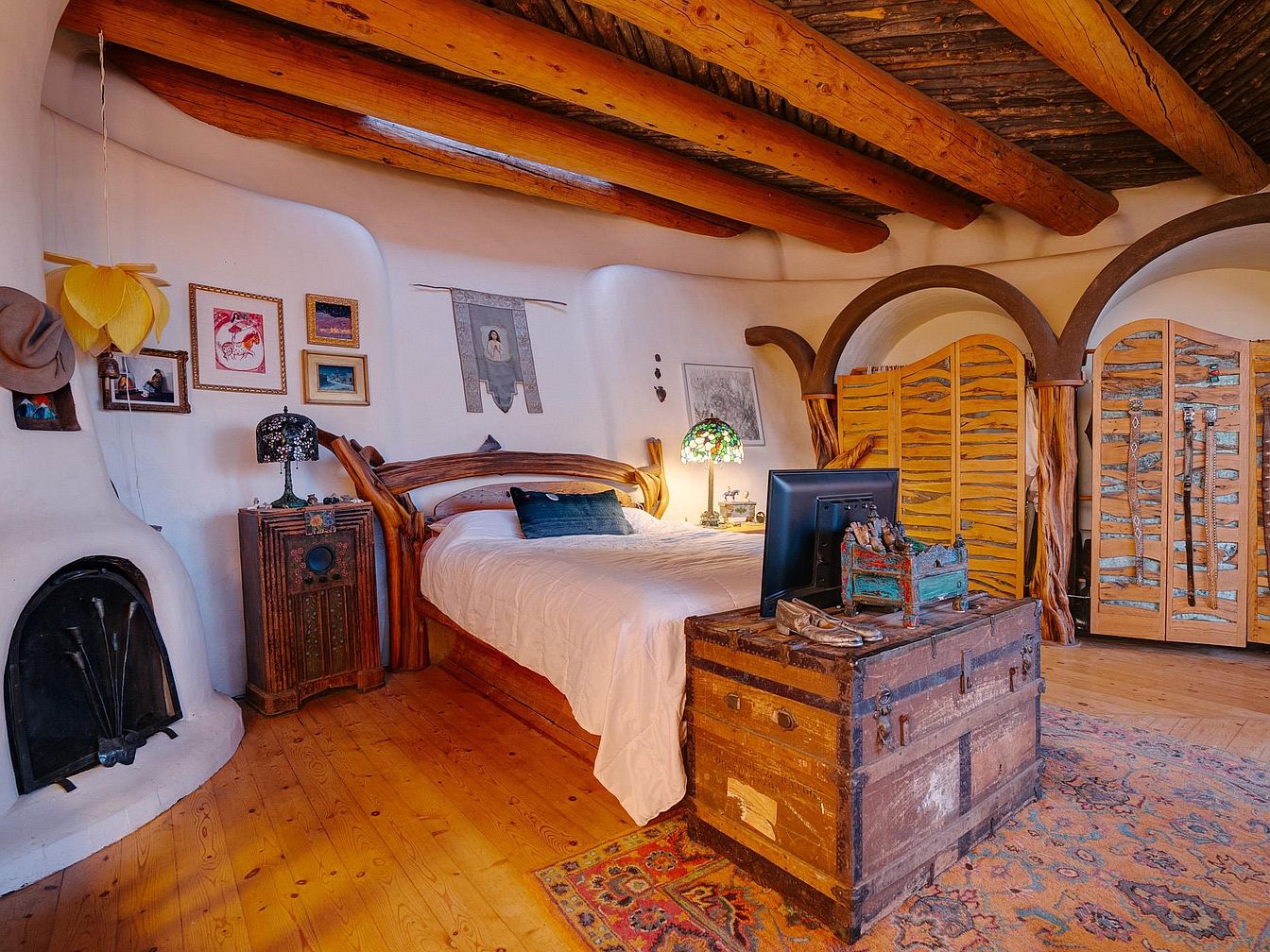 This intimate bedroom features a unique adobe design with rounded walls and natural wooden beams, creating a warm and inviting atmosphere. The earthy color palette of beige and brown harmonizes beautifully with the rich textures of wooden furniture and the vibrant area rug. A spacious bed is adorned with a minimalist white duvet, complemented by a blue accent pillow, while rustic touches like an antique trunk serve as a stylish nightstand. Art decorates the walls, providing a personal flair, while the stained glass lamp casts a soft glow, enhancing the cozy, family-friendly ambiance of this charming retreat.