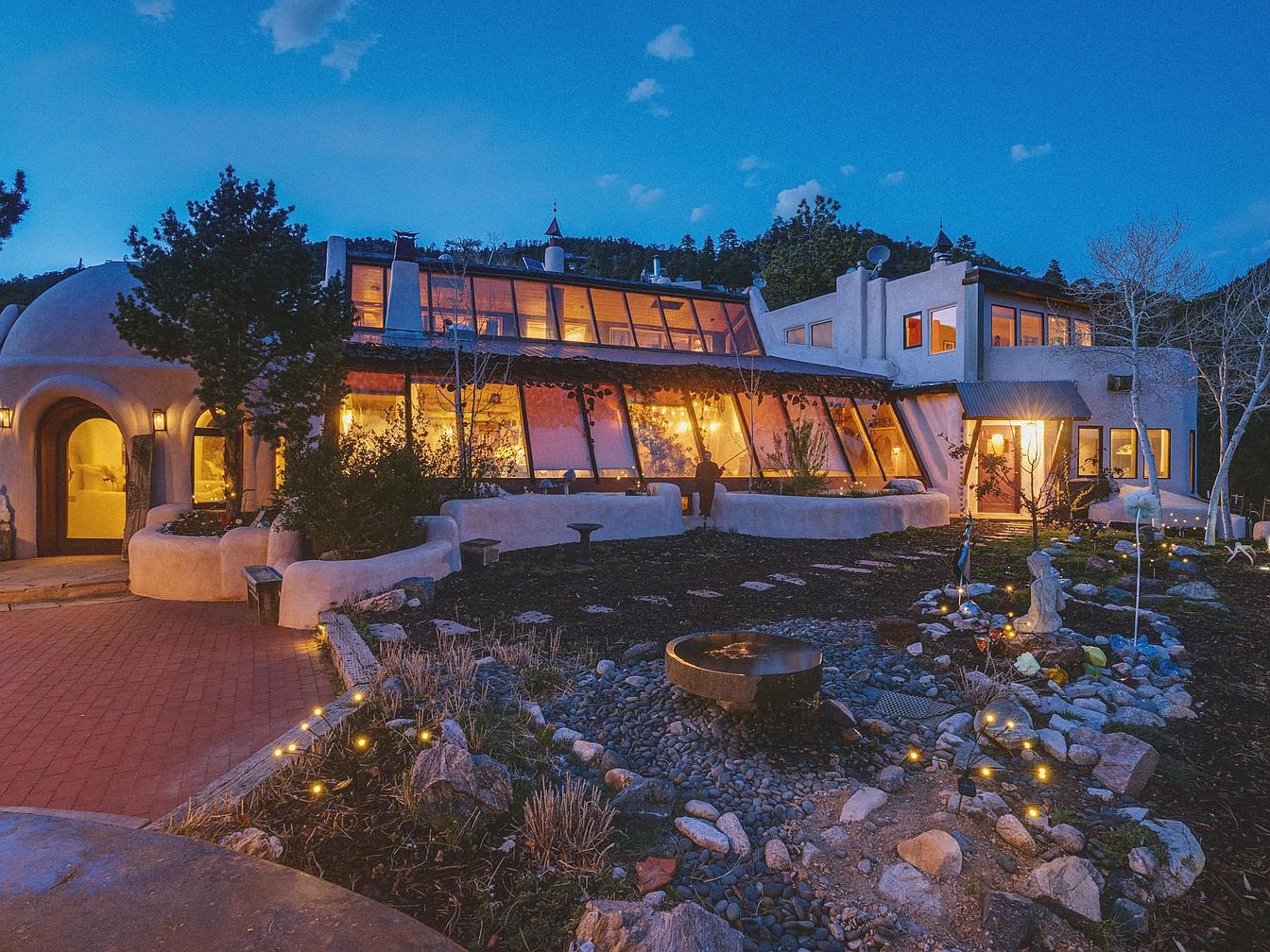 This unique American home features a blend of rustic charm and modern design, exemplified by its curved adobe-style walls and expansive glass windows. The inviting entryway, framed by warm landscape lighting, sets a welcoming tone. A generous layout incorporates beautifully landscaped grounds with flagstone pathways and ornamental stones, perfect for family activities. The warm color palette harmonizes with the natural surroundings, while elegant architectural details like arched doorways and artistic sculptures add character. At dusk, the illuminated home captures a serene ambiance, inviting relaxation and connection with nature, making it an ideal sanctuary for family gatherings.