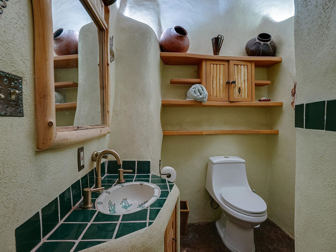 This inviting bathroom features a unique adobe-inspired architecture, showcasing curved walls that create a cozy ambiance. The earthy green color scheme harmonizes with natural materials, highlighted by wooden shelves displaying terracotta pots. A handcrafted sink with intricate floral designs complements the rich green tiled countertop, while rustic wooden cabinetry adds warmth and functional storage. Elegant bronze fixtures enhance the modern conveniences amid the organic aesthetic. Practical features include ample shelving for towels and toiletries, ensuring a family-friendly space. Soft lighting accentuates the textures, creating a tranquil atmosphere perfect for relaxation and rejuvenation.