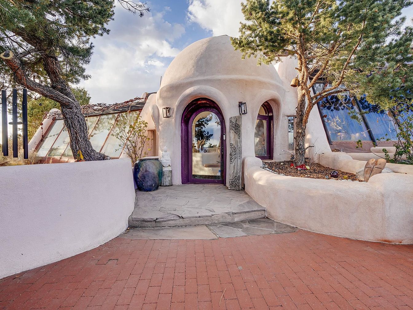 A charming entrance welcomes visitors with its unique architectural design and natural elements. The rounded adobe structure features a domed roof that harmonizes with the surrounding landscape, complemented by a soft, earthy color palette of warm creams and soft browns. The inviting purple door acts as a stunning focal point amid the light stucco walls, enhanced by two large windows that brighten the entryway. The pathway, crafted from natural stone, guides you through a serene seating area adorned with native plants and decorative accents. This entrance not only showcases artistic flair but also promotes a friendly, inviting atmosphere.
