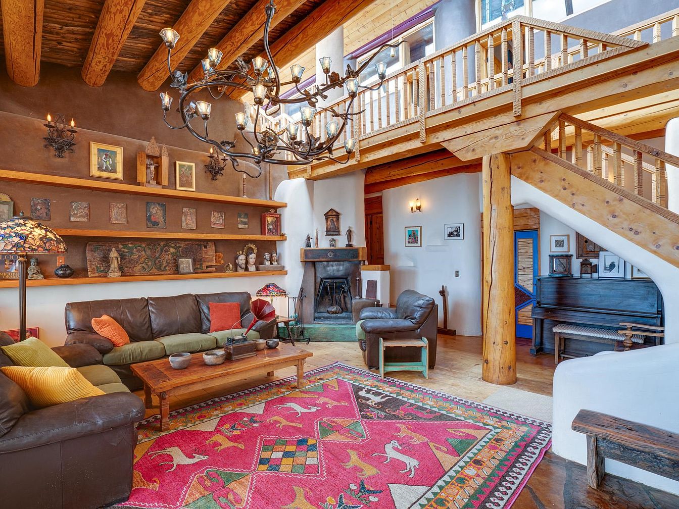 This inviting living room features a harmonious blend of rustic elements and vibrant color schemes, showcasing wooden beams and a warm, earthy palette. A plush leather sectional, adorned with colorful throw pillows, invites relaxation, while a handwoven area rug adds a touch of uniqueness. The focal point is a charming fireplace, framed by an artistic shelf displaying eclectic decor, enhancing the space’s character. Natural light floods in, creating an airy atmosphere complemented by elegant lighting fixtures. A grand piano and a range of artwork capture the artistic spirit of the home, making this space perfect for family gatherings and entertaining.