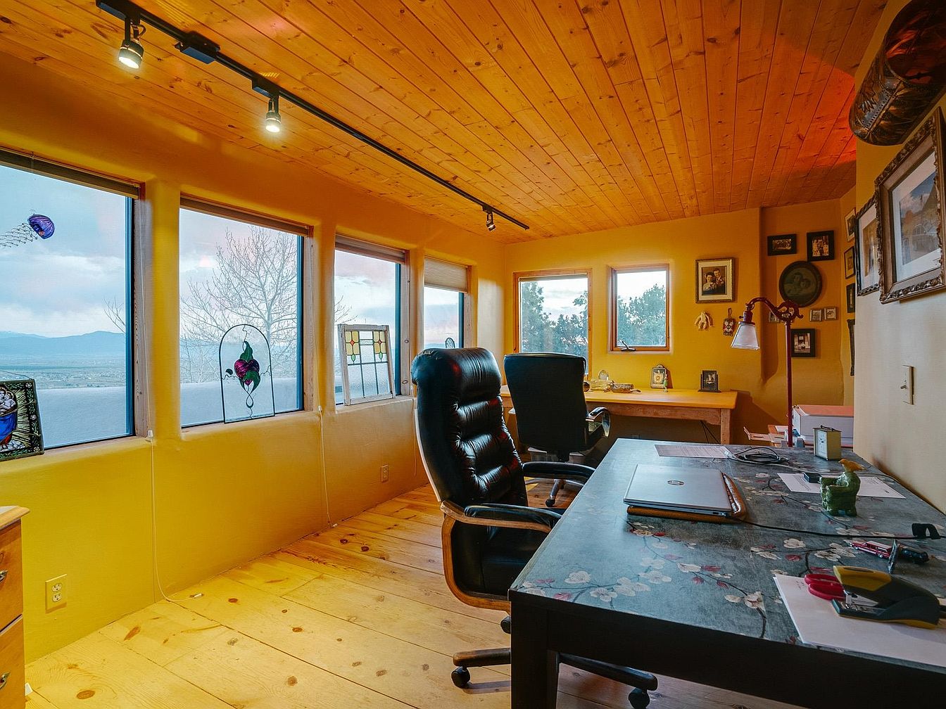 This inviting home office features a cozy layout illuminated by natural light streaming through large windows. The warm golden hues of the walls complement the rich wooden ceiling and flooring, creating a harmonious atmosphere. A sturdy desk adorned with floral patterns accommodates a laptop, while ergonomic chairs ensure comfort during long working hours. Family-friendly elements are evident in the carefully arranged personal photos and artwork, lending a sense of warmth and intimacy to the space. The room’s productivity is further enhanced by stylish track lighting, making it a perfect blend of function and aesthetic appeal.