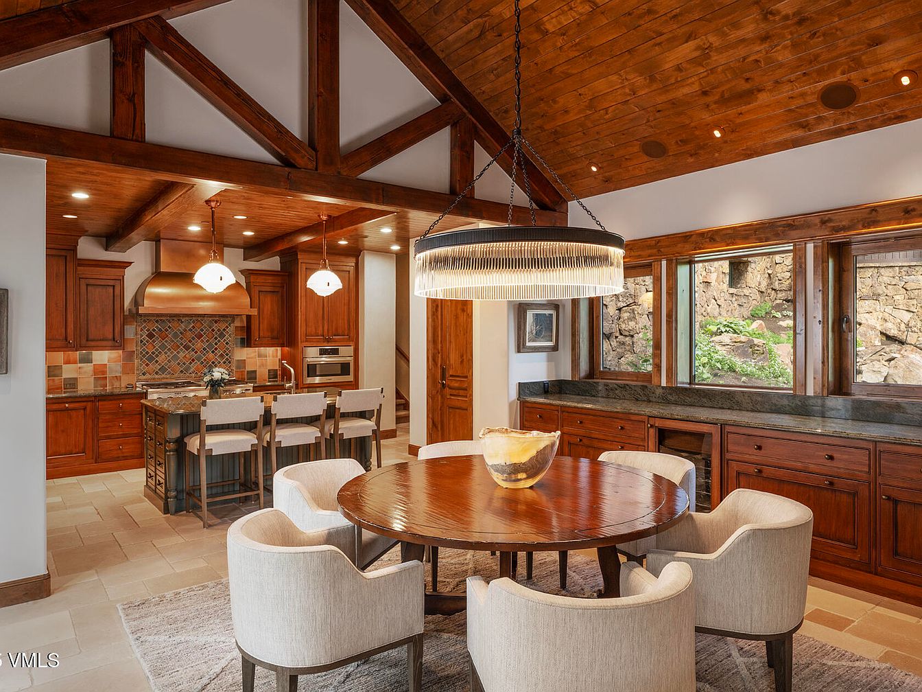 This inviting dining area seamlessly integrates with the adjacent kitchen, showcasing a blend of rustic and contemporary design. Rich wooden beams grace the high ceiling, while the warm tones of the cabinetry complement the sophisticated stone countertops. A circular wooden table invites family gatherings, surrounded by plush, upholstered chairs, perfect for prolonged dinners. Natural light filters through large windows, accentuating the earthy color palette with splashes of green from the outdoor landscape. Thoughtful details, like the modern chandelier and stylish decor accents, create an atmosphere that is both cozy and elegant, ideal for entertaining or casual meals.
