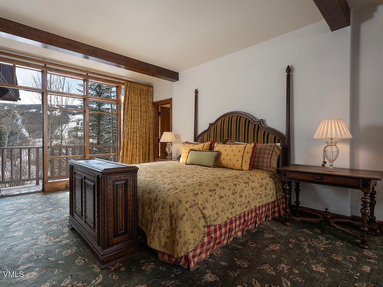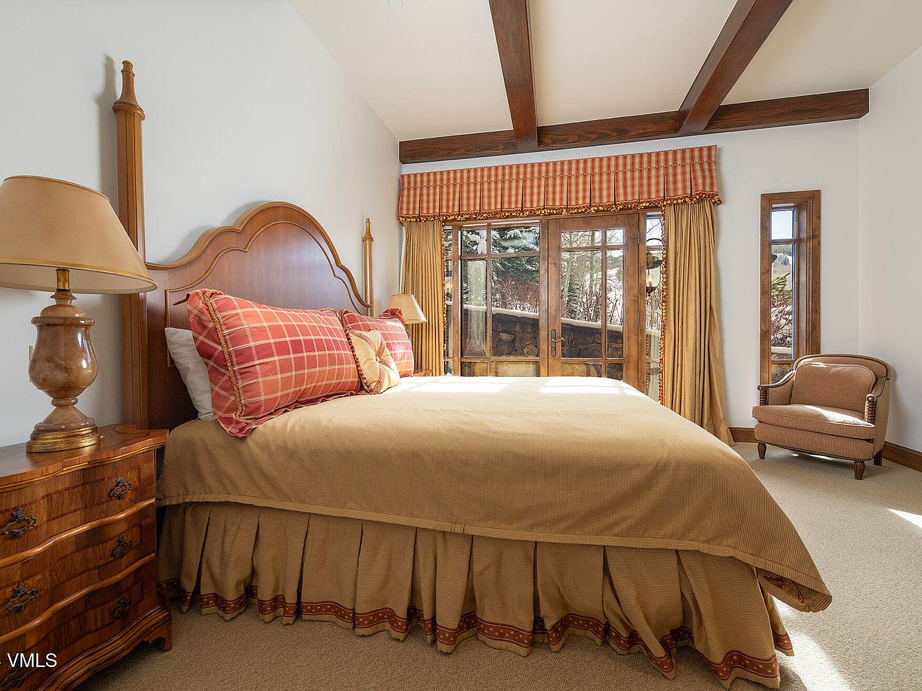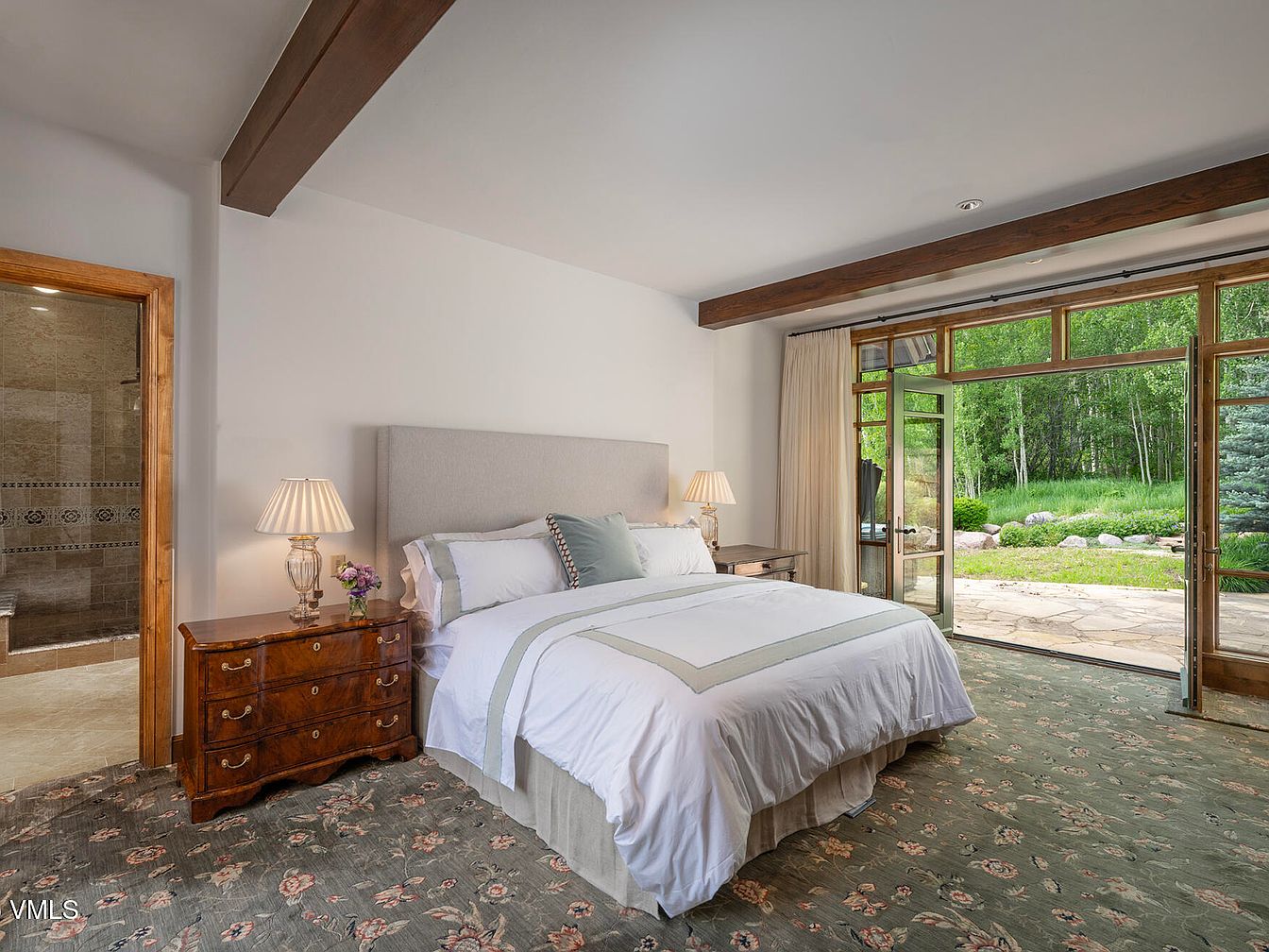 This master bedroom features a serene layout that seamlessly blends comfort with elegance. A plush, upholstered headboard complements the crisp white bedding adorned with subtle accents. Rich wood beams overhead add warmth, while large sliding glass doors invite natural light and offer stunning views of the lush outdoors. The carefully chosen color scheme of muted greens and floral patterns creates a calming atmosphere, perfectly suited for relaxation. A vintage wooden dresser paired with stylish bedside lamps enhances the space’s character, making it family-friendly and inviting. The soft carpeting grounds the room, ensuring a cozy retreat for all.