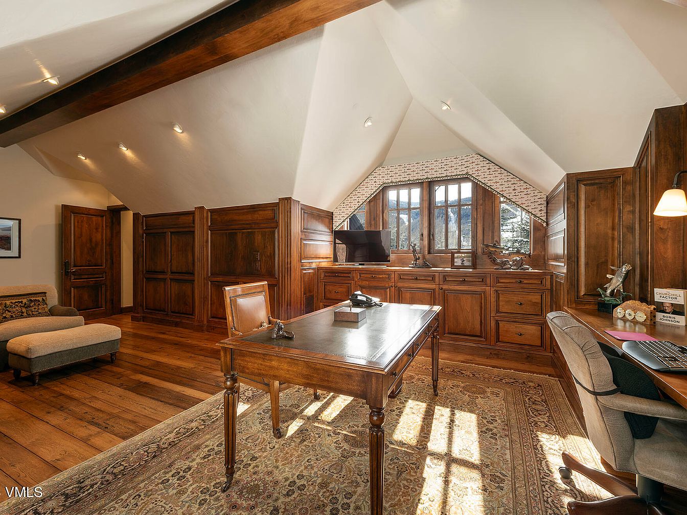 A stunning home office reveals an elegant yet functional design, where rich wooden paneling and beams create an inviting atmosphere. The vaulted ceiling enhances the spaciousness, while natural light floods in through large windows, showcasing scenic views. A polished wooden desk sits center stage, complemented by an ergonomic chair and decorative accents that add character. The room features a cozy seating area with a tastefully upholstered lounge chair, perfect for quiet breaks. Warm earth tones and intricate area rugs contribute to a welcoming vibe, making this space an ideal blend of productivity and comfort for family activities.