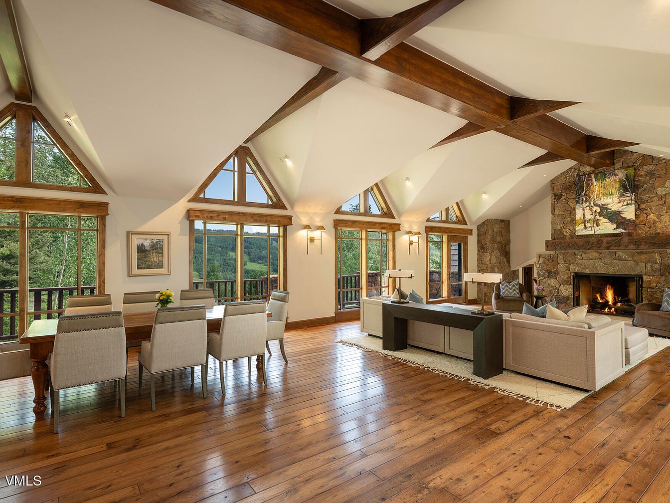 This spacious open concept living area features soaring ceilings enhanced by striking wooden beams, creating an inviting and airy atmosphere. Large, triangular windows flood the room with natural light, framing breathtaking views of the surrounding landscape. A cozy stone fireplace serves as the focal point, flanked by comfortable seating that encourages family gatherings. The neutral color scheme, coupled with warm wooden accents and plush textiles, adds to the modern rustic charm. A beautifully crafted dining table accommodates family meals, while the hardwood floors offer durability and warmth, making this space perfect for creating cherished memories.