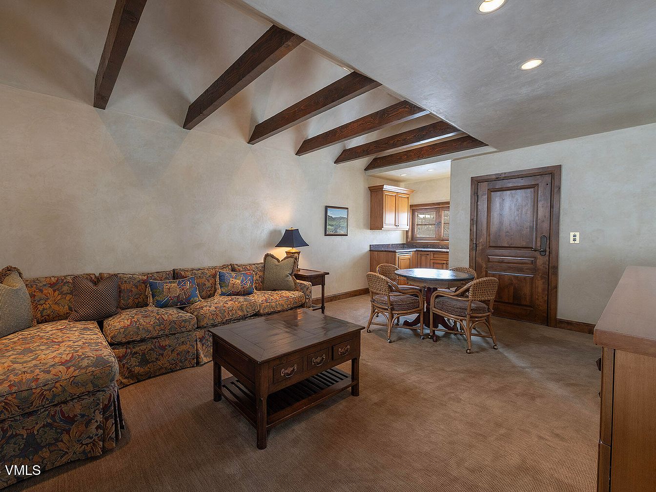 This inviting living area merges comfort with style, showcasing a spacious layout accentuated by exposed wooden beams that stretch across the ceiling. The sumptuous, floral-patterned sectional invites relaxation and family gatherings, while the rich, dark wood coffee table adds a touch of rustic elegance. Soft beige walls create a warm atmosphere, harmonizing beautifully with the neutral carpeting. A small dining table with wicker chairs offers a perfect space for intimate meals or games. The kitchen area, visible in the background, features wooden cabinetry and subtle countertop textures, enhancing the home’s welcoming appeal and family-friendly ambiance.
