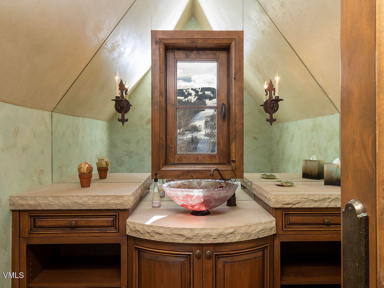 This bathroom features a distinct, sloped ceiling that adds charm and character. The soft green walls, adorned with subtle textures, create a serene ambiance, complemented by natural wooden accents. A beautifully crafted countertop, mimicking stone, pairs seamlessly with elegant cabinetry, offering ample storage solutions. A striking vessel sink, with hues of red and pink, serves as a stunning focal point. Antique-style sconces illuminate the space, casting a warm glow. The small window provides picturesque views of the outdoors, enhancing the connection with nature. This design emphasizes both aesthetics and functionality, making it perfect for family use.