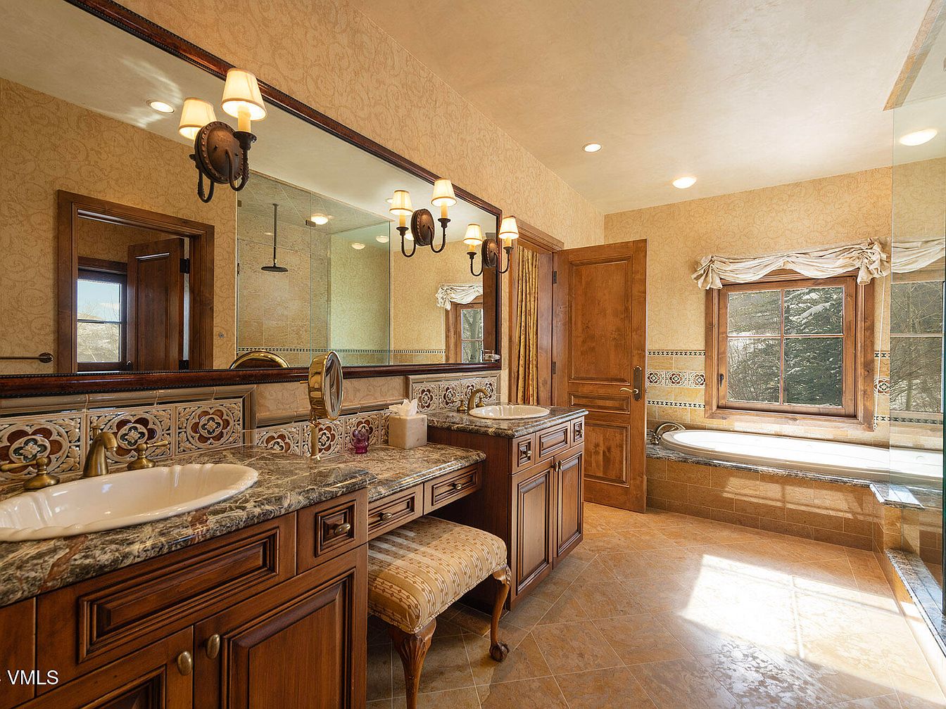 This luxurious bathroom blends classic elegance with modern functionality. Rich wooden cabinetry with intricate details complements a marble countertop, featuring dual sinks for convenience. The warm, neutral color palette is enhanced by the textured wallpaper and artisan tile work, adding visual interest. A spacious glass shower ensures a spa-like experience, while a freestanding soaking tub by the window invites relaxation and natural light. Family-friendly design elements include ample storage for essentials and an inviting makeup vanity area. Thoughtful lighting, including wall sconces and recessed fixtures, creates a warm ambiance, perfect for unwinding after a long day.