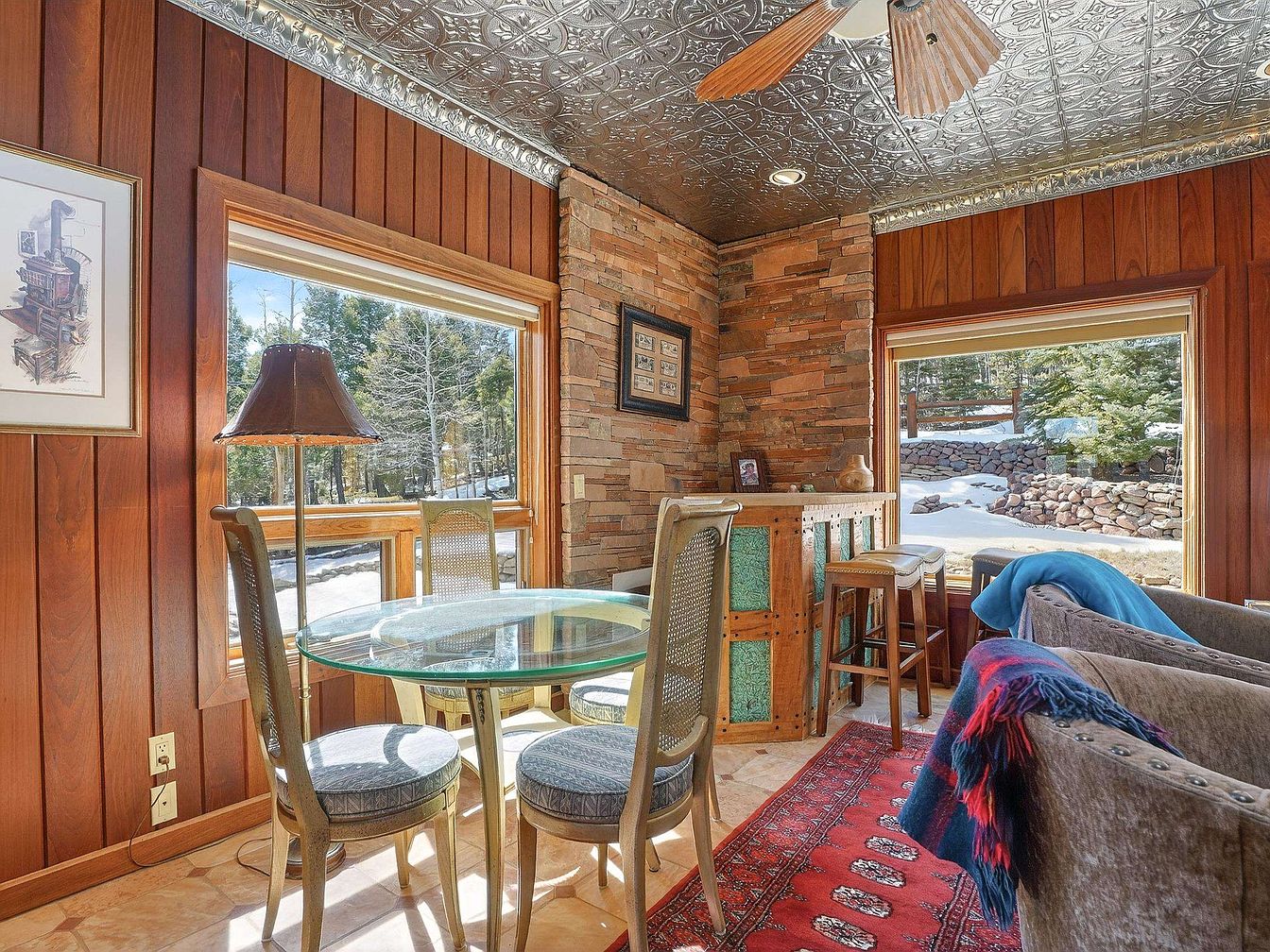 This charming dining nook features a circular glass table surrounded by upholstered chairs, creating an inviting space for family meals or morning coffee. Natural light floods the area through expansive windows, showcasing enchanting outdoor views. The rich wood paneling and a stunning stone accent wall add warmth and texture, while the intricately designed tin ceiling elevates the room’s aesthetic. A vintage lamp near the table provides a cozy glow, enhancing the ambiance. Soft color tones, combined with a vibrant area rug, harmonize beautifully, making this nook a perfect blend of comfort and style for gatherings and relaxation.