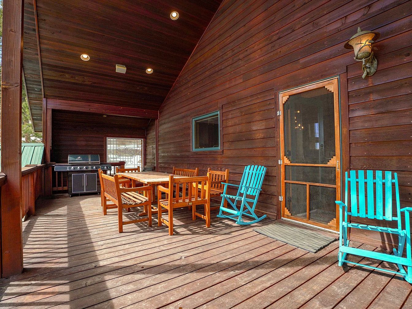 This charming outdoor patio blends rustic warmth with modern functionality, perfect for family gatherings. Wooden beams and planks create a cozy atmosphere, complemented by a stunning hardwood floor. A spacious dining table invites lively meals al fresco, while colorful rocking chairs add a whimsical touch. A built-in grill makes outdoor cooking effortless, enhancing the culinary experience. Store your favorite snacks and drinks in the nearby outdoor kitchen area, designed for convenience. Large windows allow natural light to flow in, framing views of the surroundings. The inviting color palette, rich in browns and vivid teal, promotes relaxation and enjoyment.