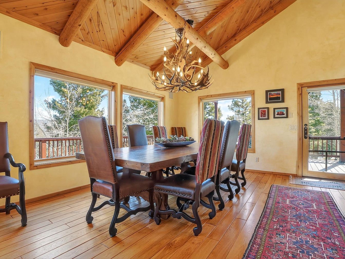 This warm and inviting dining room features vaulted ceilings adorned with rich wooden beams, enhancing the rustic charm. The spacious layout effortlessly accommodates family gatherings around a robust wooden table, paired with plush leather and striped seats that provide both comfort and style. Large windows invite abundant natural light, offering picturesque views of the outdoors while creating a harmonious connection with nature. Earthy tones in the walls complement the warm wooden flooring, creating a cozy yet elegant atmosphere. The striking antler chandelier adds a unique focal point, perfectly blending contemporary design with traditional elements.