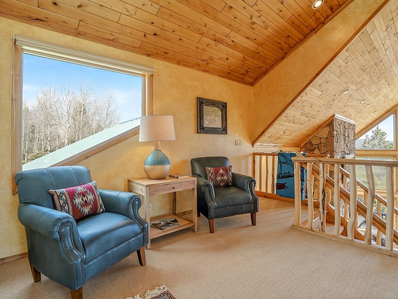 This inviting loft area combines rustic charm with contemporary comfort, featuring vaulted ceilings and ample natural light from the large window. The warm, textured walls are harmonized with a rich wood ceiling, creating an inviting ambiance. A pair of plush, blue leather armchairs, adorned with decorative pillows, offer a perfect spot to unwind while overlooking scenic views. A minimalist wooden side table holds a stylish lamp, enhancing the cozy setting. The plush carpet underfoot adds warmth, making this multi-functional space ideal for family gatherings or quiet reading nooks. Thoughtfully designed, it balances style with functionality.