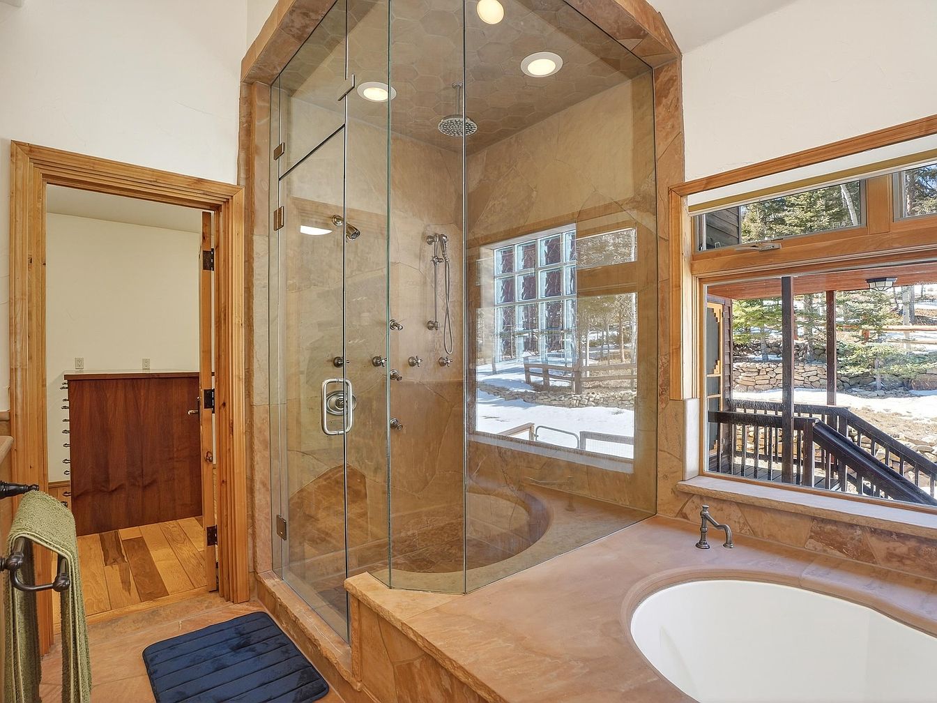 A spacious bathroom featuring a sleek glass shower with premium fixtures, inviting natural light through large windows. The warm tones of the rich wooden cabinetry contrast beautifully against the elegant stone tile, creating a harmonious blend of modern and rustic aesthetics. A deep soaking tub positioned beside the window offers a tranquil view of the outdoor landscape. Family-friendly elements include easy-to-clean surfaces and ample storage for toiletries. An inviting color palette enhances the room’s soothing ambiance, while carefully curated architectural details, such as decorative molding and well-placed lighting, complete this luxurious retreat.