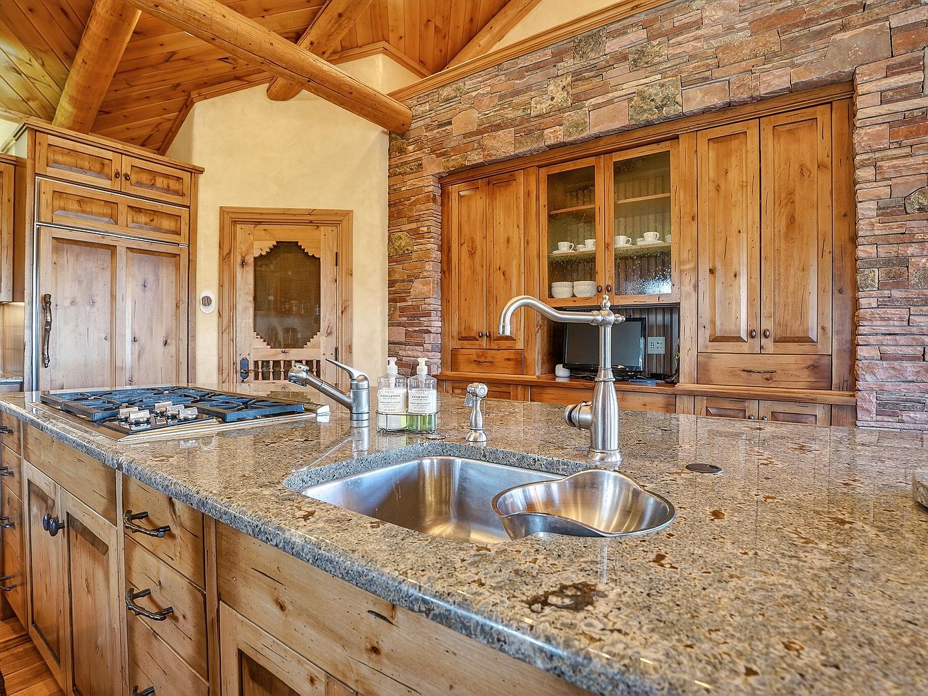 This rustic kitchen space showcases beautiful wooden cabinetry adorned with natural grain patterns, creating a warm and inviting atmosphere. The large central island features a polished granite countertop, ideal for meal preparation or casual dining. A sophisticated gas range is installed, allowing for versatile cooking options, while the sleek silver faucet adds a contemporary touch. Accentuating the charm, the stone accent wall offers a stunning visual backdrop, harmonizing with the wood ceiling beams overhead. This family-friendly layout maximizes comfort and functionality, making it perfect for both everyday meals and entertaining guests in a cozy setting.