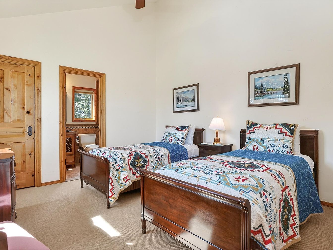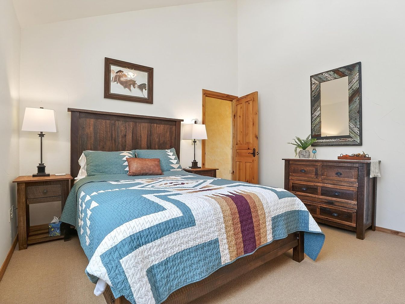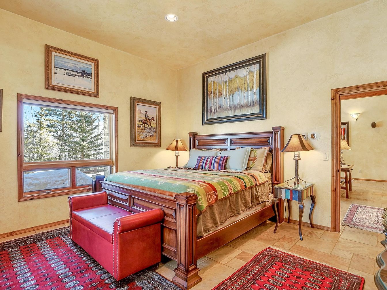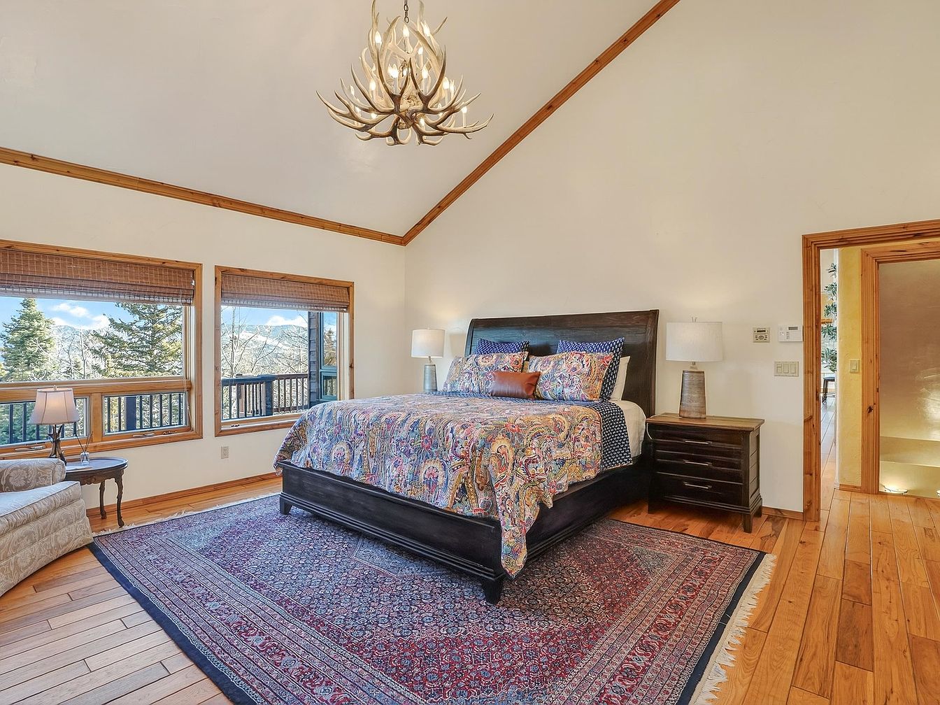 This master bedroom features high, vaulted ceilings that enhance the spaciousness and warmth of the space. Natural wood beams frame the room, complementing the rich wooden floorboards. A luxurious king-sized bed, adorned with a vibrant, patterned quilt, anchors the room, paired with elegant nightstands that include stylish lamps. Large windows invite abundant natural light and showcase breathtaking mountain views, enhancing the tranquil ambiance. Cozy seating in the corner provides an inviting reading nook, while the intricate area rug tessellates beautifully with the overall decor. Family-friendly features include easy-to-clean surfaces and ample storage, creating a harmonious retreat.