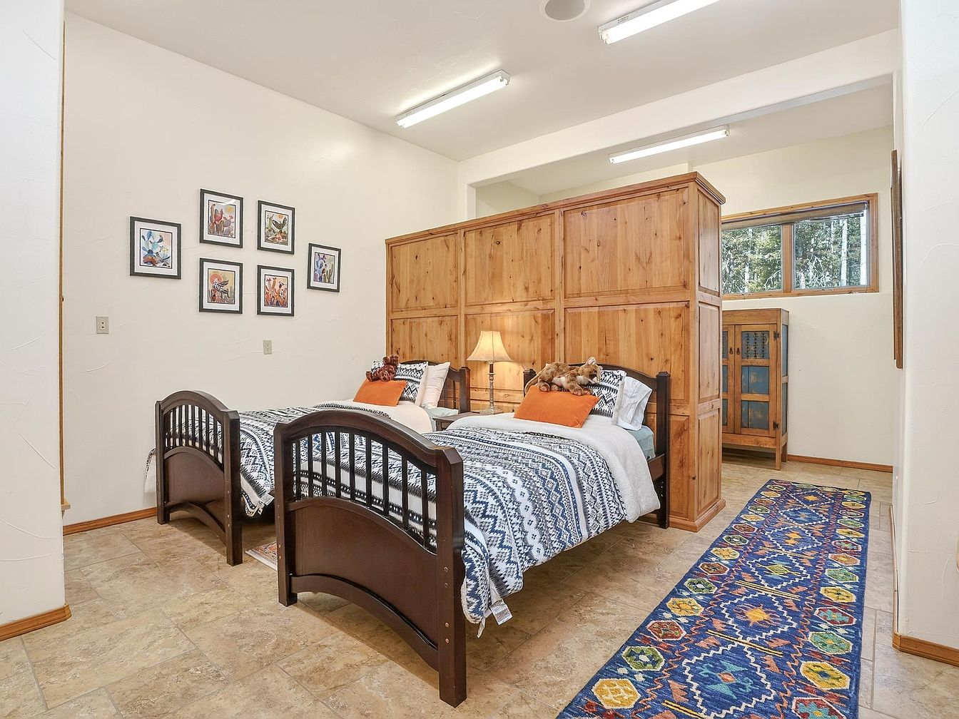 This charming kid’s bedroom features two twin beds, each adorned with blue and white patterned linens, inviting warmth and comfort. The warm wooden furniture, including a tall wardrobe and a subtle divider, enhances the cozy atmosphere. Natural light pours in through the window, illuminating the space and highlighting the colorful artwork mounted on the wall. A vibrant area rug adds a playful touch underfoot, complementing the earthy tones of the tiled floor. A bedside lamp and plush toys create a welcoming environment for children, encouraging creativity and relaxation in this family-friendly retreat.