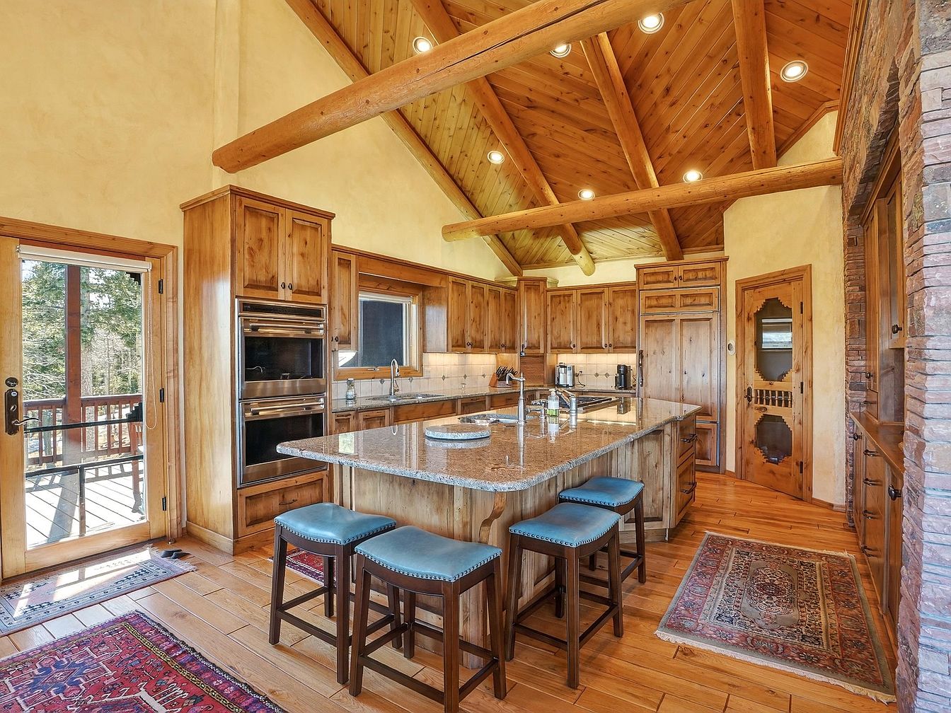 This spacious kitchen features an inviting open layout, enhanced by soaring vaulted ceilings constructed from natural wood beams. The warm tones of the wooden cabinetry harmonize beautifully with the light granite countertops, offering both elegance and functionality. A large island serves as a central gathering point, with comfortable blue upholstered stools that encourage casual dining. The kitchen is thoughtfully designed with modern appliances, ample storage, and large windows allowing natural light to flood the space. Rustic accents, such as patterned area rugs, add a touch of charm, making it a perfect family-friendly environment for cooking and entertaining.