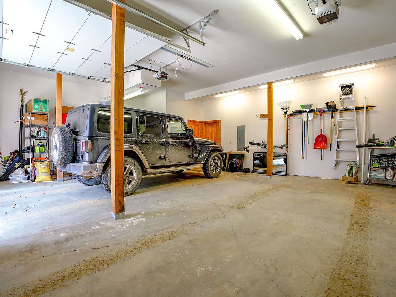 This spacious garage features robust wooden beams, supporting both functionality and an open, airy aesthetic. The concrete floor offers durability and easy maintenance, ideal for a busy household. A rugged SUV sits prominently, demonstrating practicality for everyday life. Adjacent to the vehicle, organized shelving displays a variety of tools and storage bins, reflecting a well-structured environment conducive to hobbies or projects. Clean lines and neutral colors combined with effective task lighting enhance visibility. This garage harmoniously balances functionality with a family-friendly atmosphere, making it a versatile space for both vehicle storage and DIY endeavors.