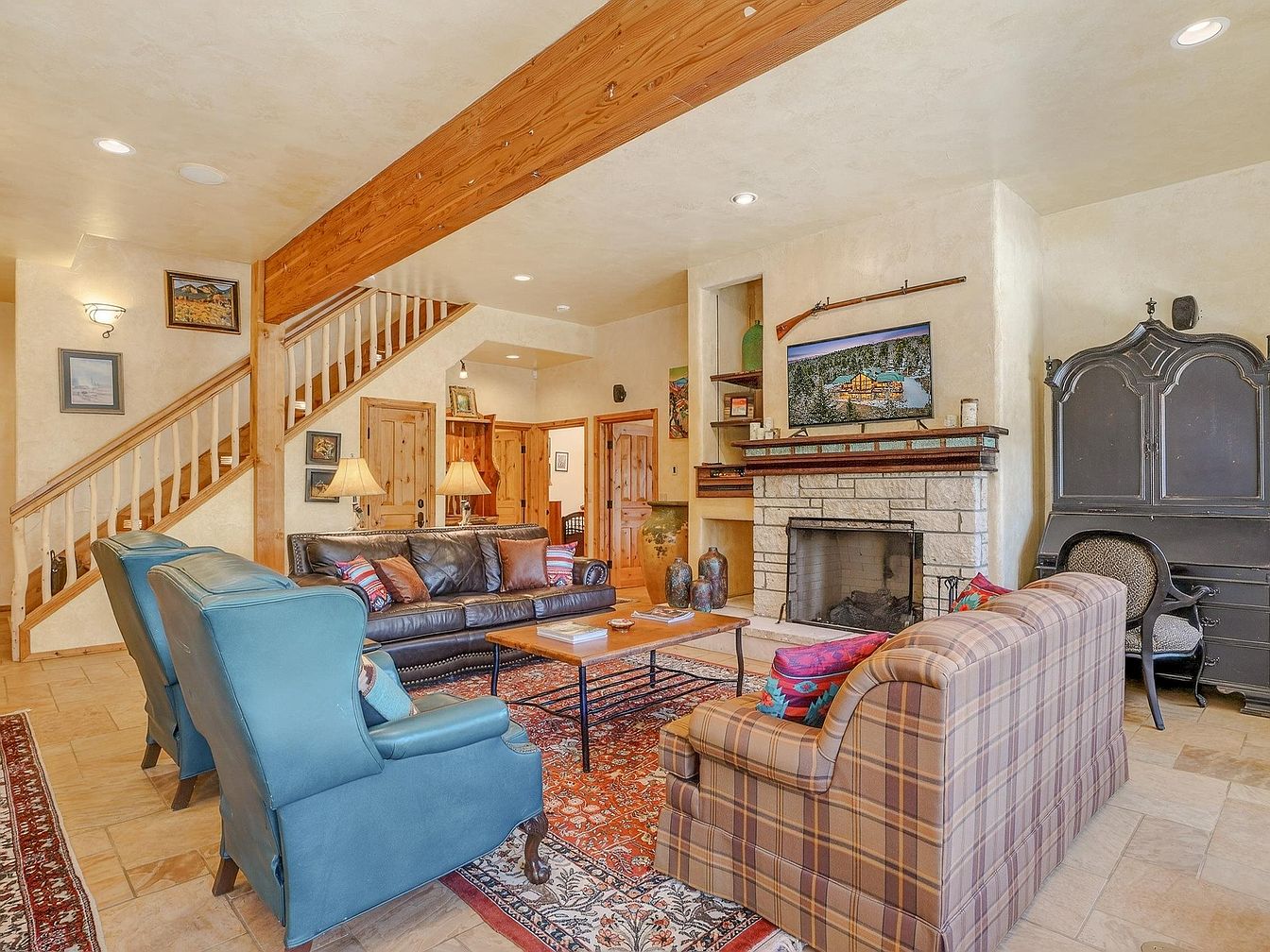This expansive great room showcases stunning cathedral ceilings complemented by large triangular windows that flood the space with natural light and offer breathtaking mountain views. The warm wooden tones and stone accents create a cozy yet elegant atmosphere. Plush seating, including a spacious sofa and inviting armchairs, encourages family gatherings, while a beautifully patterned area rug adds a splash of color against the hardwood floor. A stylish coffee table sits at the center, surrounded by delicate lamps, enhancing the room’s charm. Architectural details like exposed beams and recessed lighting further enrich the aesthetic, making this a perfect gathering space.
