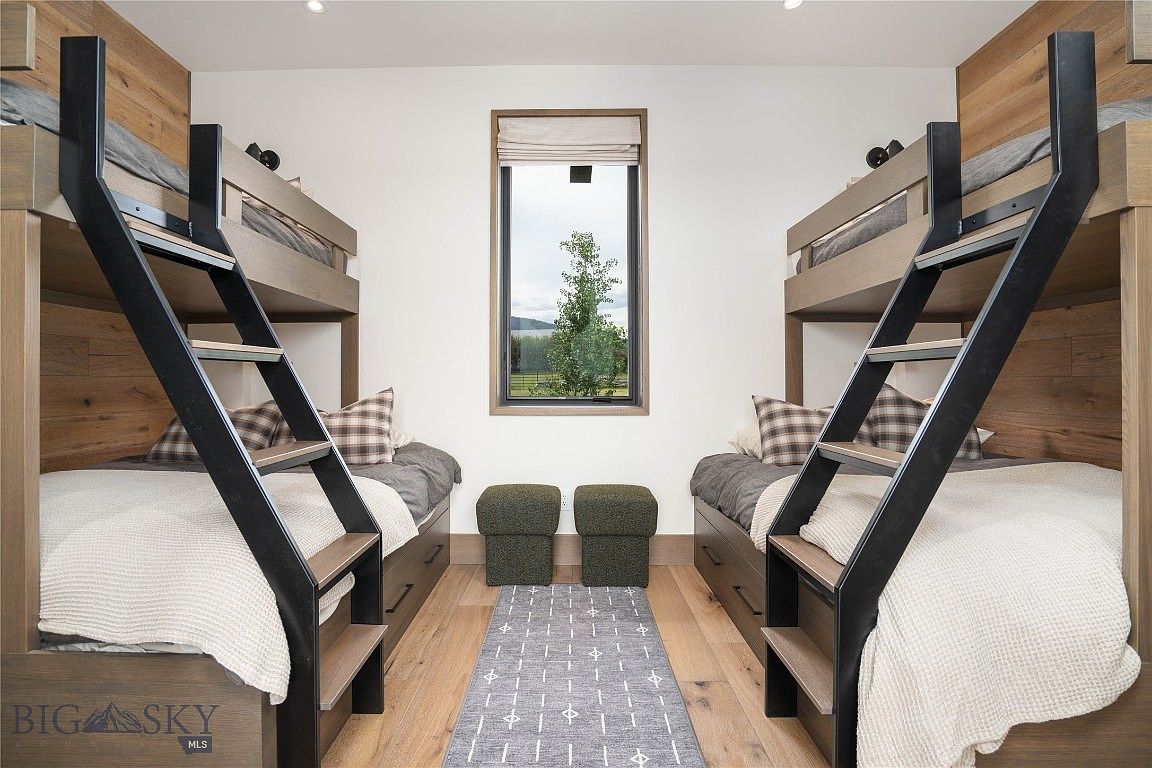 This charming kid’s bedroom features dual bunk beds, providing a cozy retreat for sleepovers and playtime. The rich wood accents complement the soft, neutral tones of the bedding, creating an inviting and warm atmosphere. Large windows frame picturesque views, filling the space with natural light and a sense of tranquility. The smart layout maximizes space, allowing for play and relaxation, while modern storage solutions beneath each bed keep the area tidy. Playful patterned rugs add texture and warmth underfoot, inviting children to feel at home in this thoughtfully designed room.