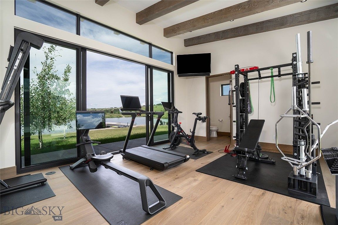 This modern home gym features an open layout with expansive windows, allowing natural light to flood the space while offering a stunning view of the greenery outside. The room is equipped with state-of-the-art workout equipment including a treadmill, stationary bike, and multifunctional weight station, promoting a versatile fitness experience. Light wood flooring complements the neutral color palette, creating a warm and inviting atmosphere. Exposed wooden beams add architectural interest to the ceiling, enhancing the contemporary design. With ample room for movement and a welcoming ambiance, this gym is perfect for maintaining an active, family-friendly lifestyle.