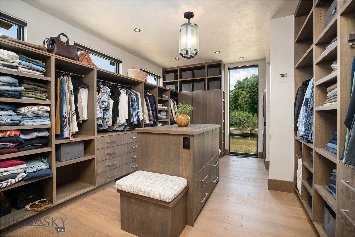This spacious walk-in closet features custom cabinetry with ample storage, showcasing an organized layout for effortless access to clothing and accessories. Soft natural light floods the space through large windows, highlighting the warm wood tones of the cabinetry and flooring. A central island provides additional workspace and features a cushioned stool for comfort. The eclectic mix of hanging and folded garments is neatly arranged, promoting a clutter-free environment. Thoughtful details include sleek metal handles, pull-out drawers for shoes, and open shelving for easy visibility, making this closet both functional and stylish, ideal for a modern family.