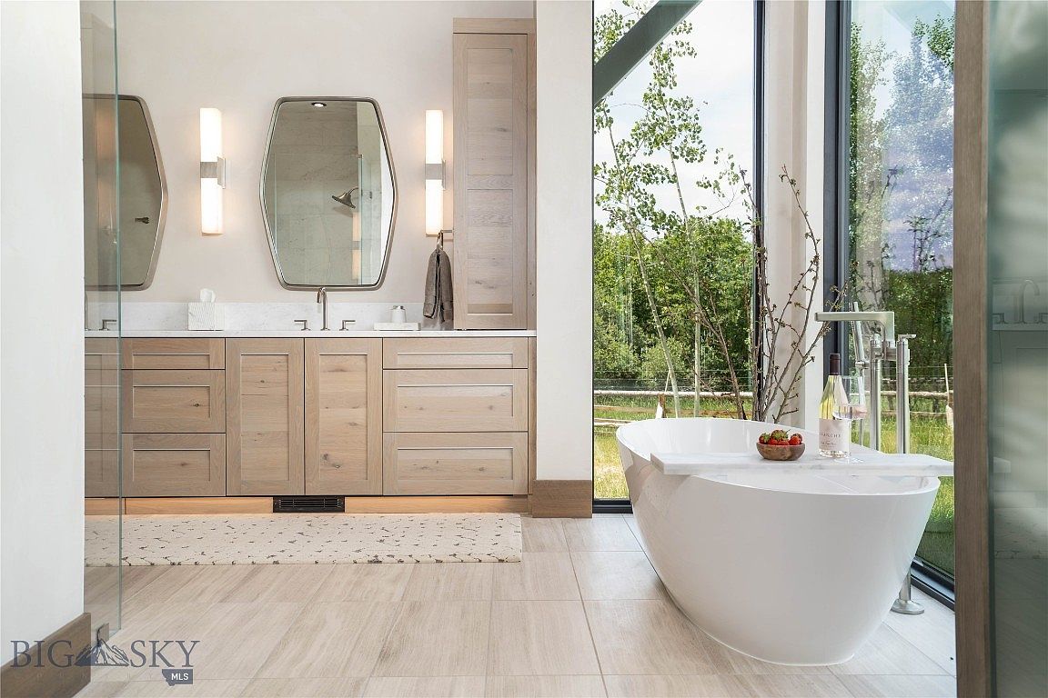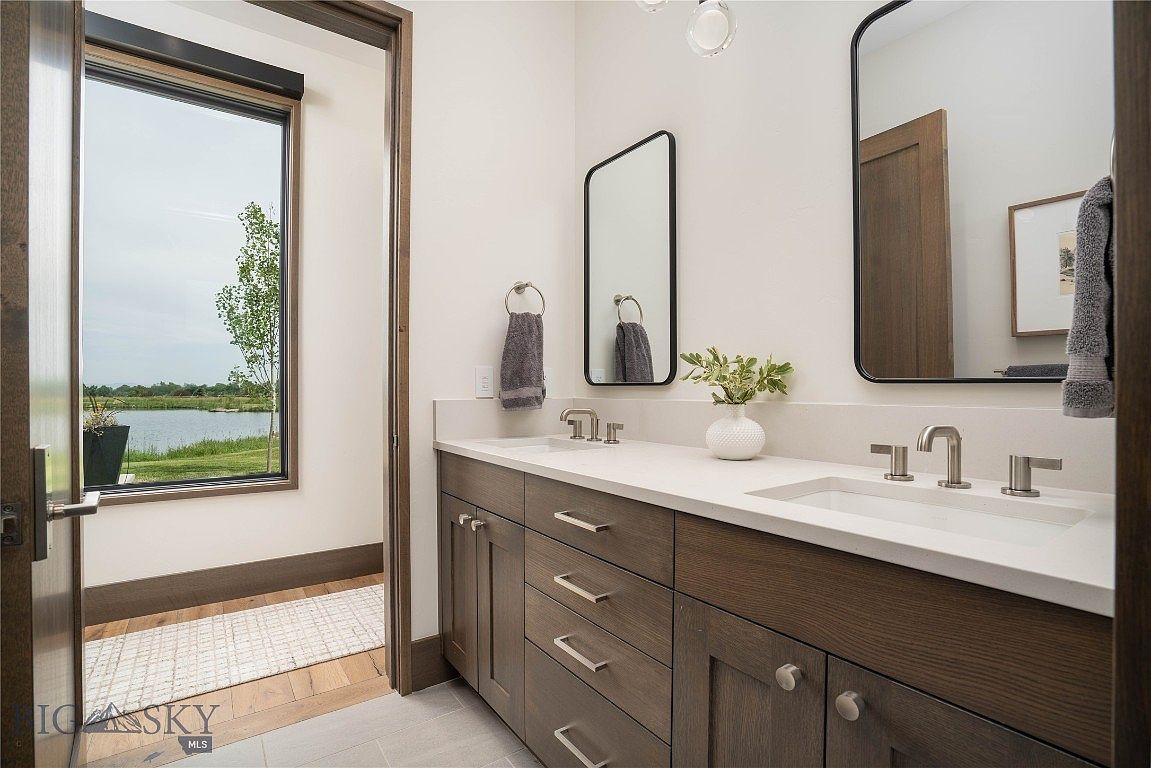 This bathroom seamlessly combines modern aesthetics with family-friendly functionality. Featuring a spacious double vanity with rich wooden cabinetry, it offers ample storage while maintaining a sleek design. Dual mirrors framed in black add a touch of elegance, complementing the neutral color palette of soft whites and warm woods. Natural light floods the space through a large window, showcasing picturesque views and enhancing the serene ambiance. Textured tile flooring, in a harmonious blend of ceramic and stone, adds a tactile element, ensuring both style and easy maintenance. Thoughtfully placed greenery brings a refreshing vibe, making it a perfect retreat.