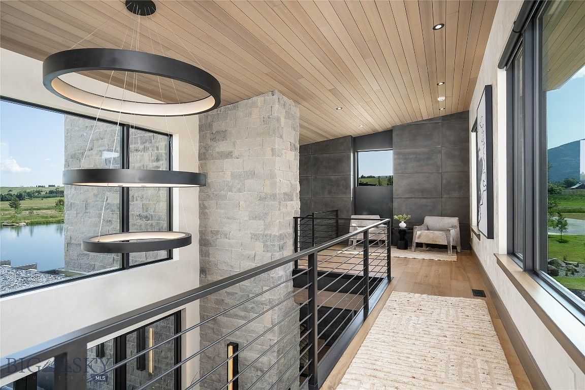 This stunning upper-level landing seamlessly blends modern elegance with a welcoming ambiance. The space features expansive windows that frame breathtaking views and flood the area with natural light. A sleek, multi-tiered chandelier hangs from a wood-paneled ceiling, enhancing the airy feel. The combination of soft, neutral tones on the walls and flooring creates a warm, inviting atmosphere. Architectural elements like the stone accent wall add texture, while the metal railing provides safety without obstructing sightlines. Cozy seating areas are perfect for relaxation, making this landing not just a passageway, but a serene retreat in the home.