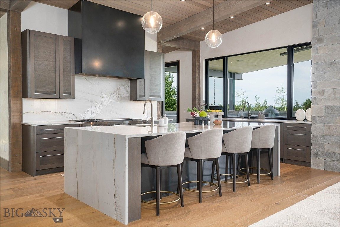 This modern gourmet kitchen features an expansive island with a stunning marbled countertop, perfect for culinary activities or casual dining. Light-colored cabinetry contrasts beautifully with dark, textured elements, creating a sophisticated aesthetic. Warm wood tones in the flooring complement the stylish exposed beams on the ceiling, enhancing the welcoming atmosphere. Sleek, high-end appliances are seamlessly integrated for a streamlined look. Large windows flood the space with natural light, showcasing picturesque views. Comfortable upholstered bar stools invite family gatherings, making this kitchen not only functional but also a hub for memorable moments and culinary creativity.