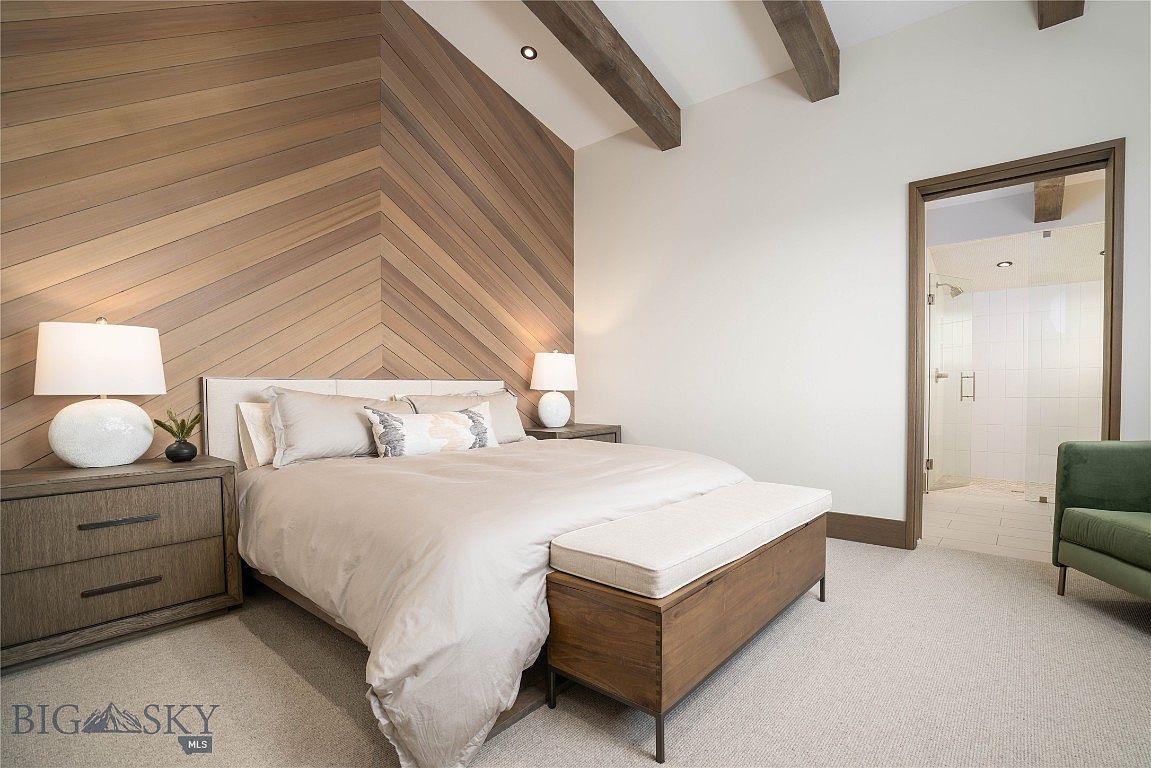 This serene master bedroom features a sophisticated layout with a striking chevron wood accent wall that adds warmth and character. The muted taupe color scheme, complemented by soft bedding and decorative pillows, enhances the calming ambiance. Light from bedside lamps creates a cozy glow, while natural wood furniture introduces an organic touch. A plush bench at the foot of the bed provides functional seating, perfect for dressing or relaxation. The adjoining door reveals a beautifully tiled bathroom, ensuring convenience. Architectural beams above add height and visual interest, making this space an ideal family-friendly retreat.