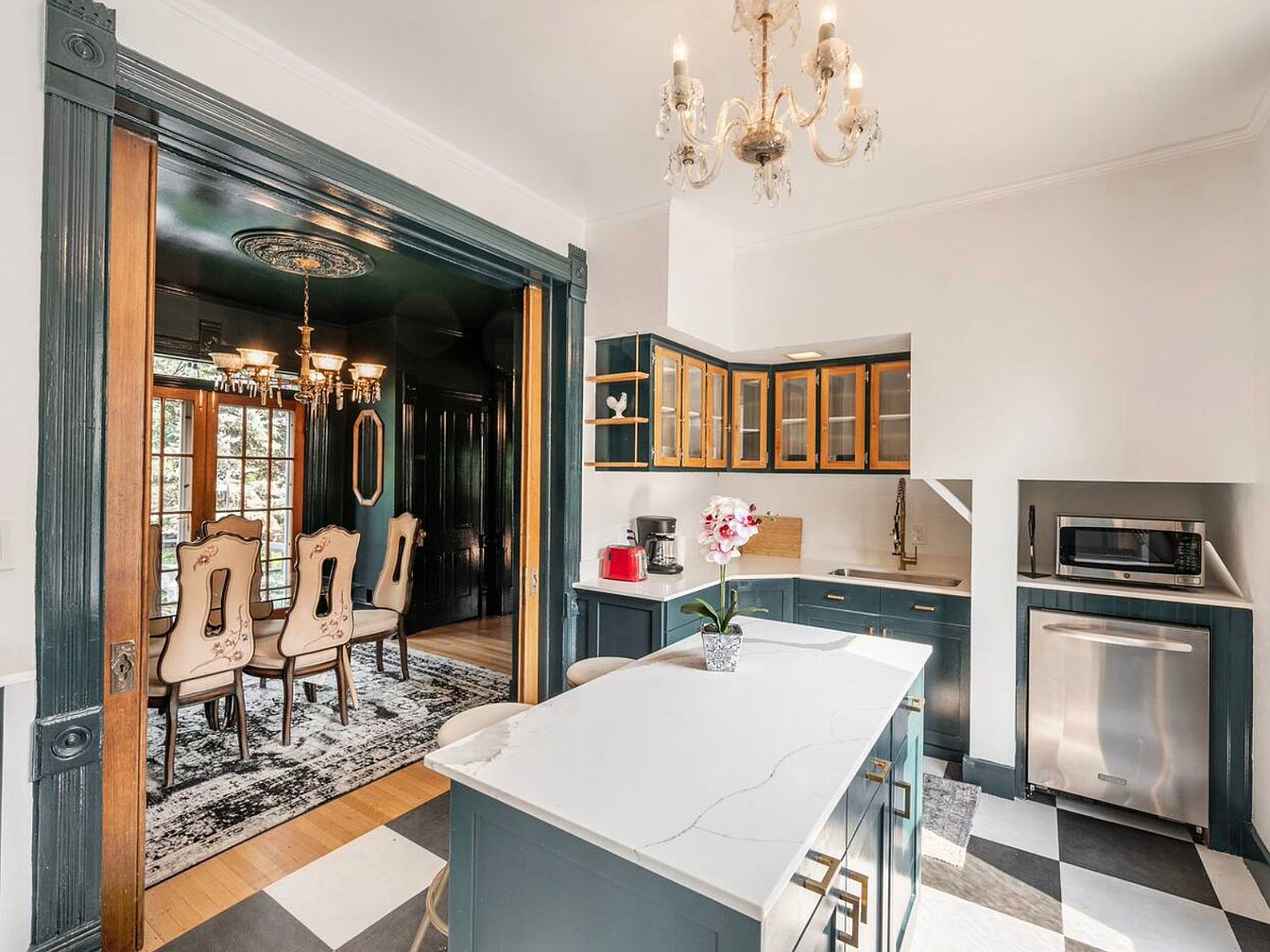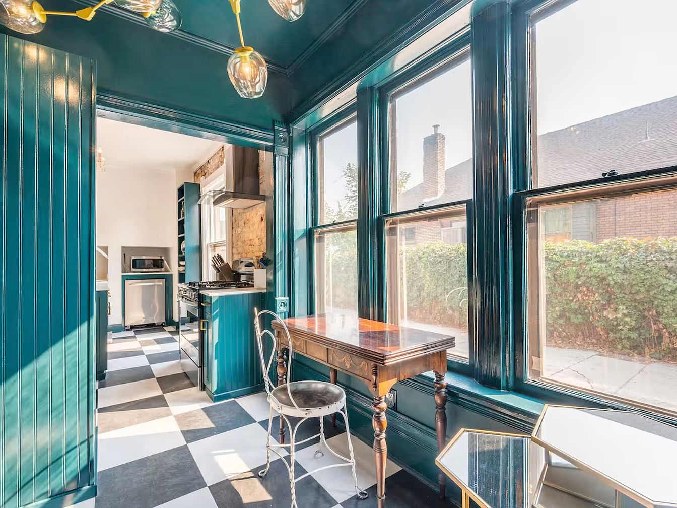 This charming kitchen dining nook features an inviting atmosphere, characterized by deep teal walls and large windows that invite abundant natural light. The classic checkered black and white floor adds a playful touch, beautifully complementing the modern cabinetry seen in the adjoining kitchen. A vintage wooden table with elegant detailing serves as a focal point, paired with a delicate metal chair. This space not only fosters family gatherings but encourages casual dining experiences. Stylish lighting fixtures suspended from the ceiling provide a warm ambiance, reflecting a blend of contemporary and traditional design that enhances the overall aesthetic.