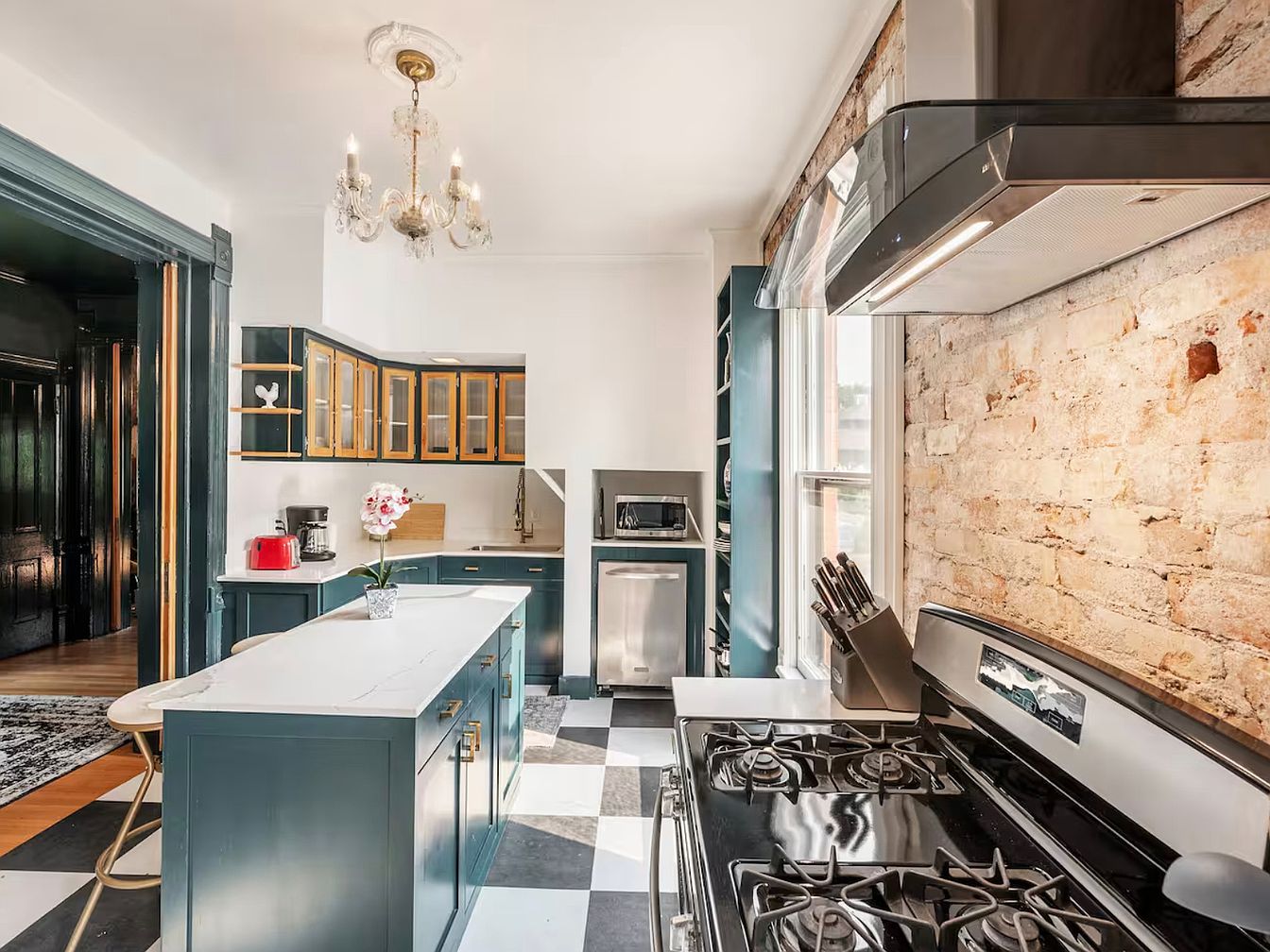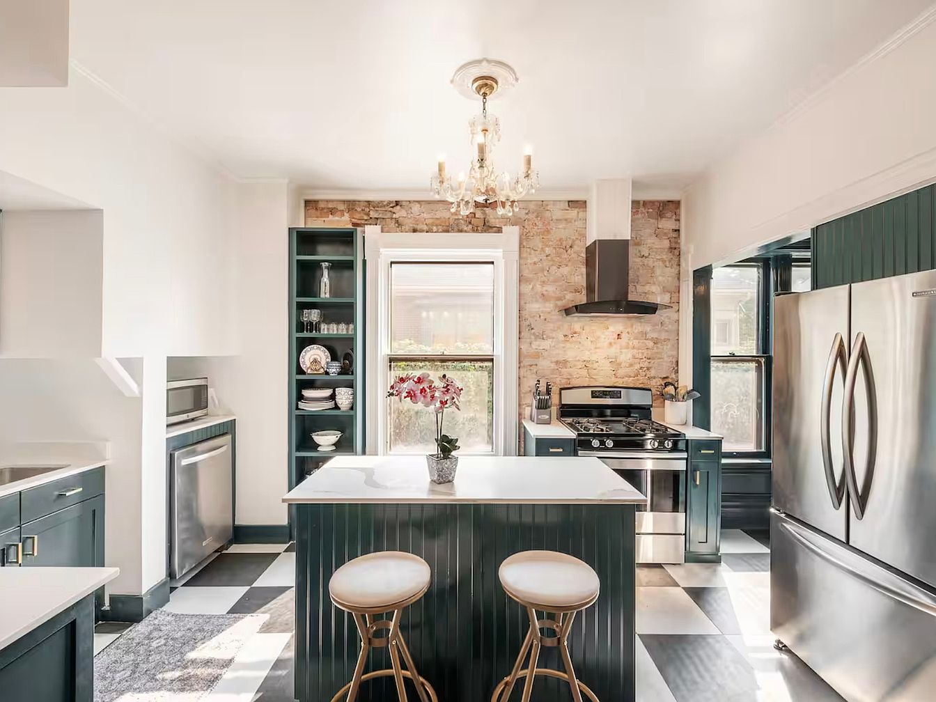 This kitchen blends modern functionality with classic charm, featuring a rich navy cabinetry paired with warm wood accents in the glass-front cabinets. The striking black and white checkered floor adds a bold statement, while a marble countertop provides elegance and ample prep space. Natural light floods the room through large windows, illuminating the exposed brick wall that adds texture and warmth. A vintage-inspired chandelier complements the contemporary fixtures, creating a welcoming atmosphere. Family-friendly elements include easy-to-clean surfaces and an open layout, perfect for gathering and entertaining. An inviting aesthetic makes this kitchen the heart of the home.