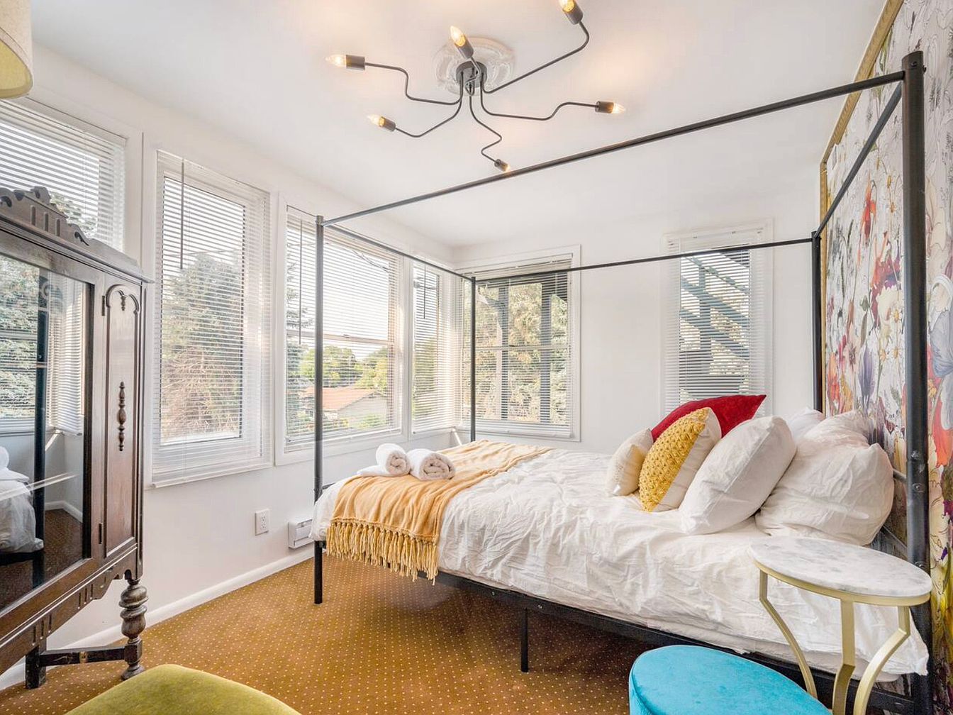 This inviting bedroom features a striking floral accent wall, showcasing vibrant colors that harmonize beautifully with the serene white bedding. A luxurious four-poster bed complements the playful arrangement of colorful throw pillows in red, yellow, and white, inviting relaxation. A sleek side table with a chic lamp provides both style and functionality, while a plush turquoise ottoman adds an unexpected pop of color. Furnished with a plush green chair, the room is designed for comfort, with warm lighting creating a cozy atmosphere. The glass-paned doors lead to a well-appointed hallway, enhancing the home’s seamless flow.