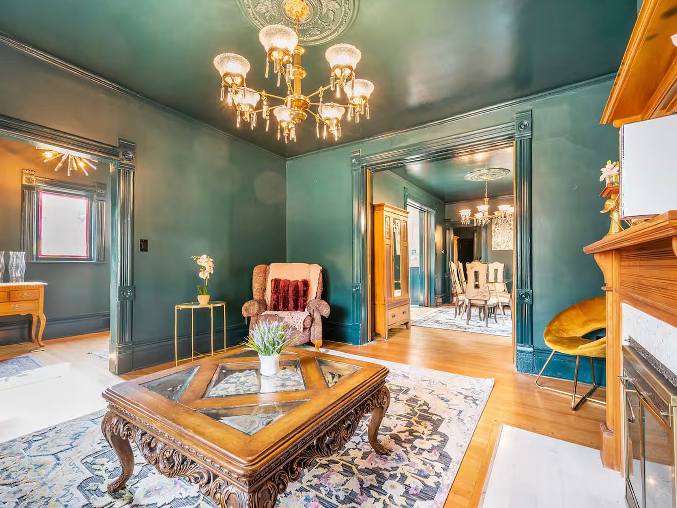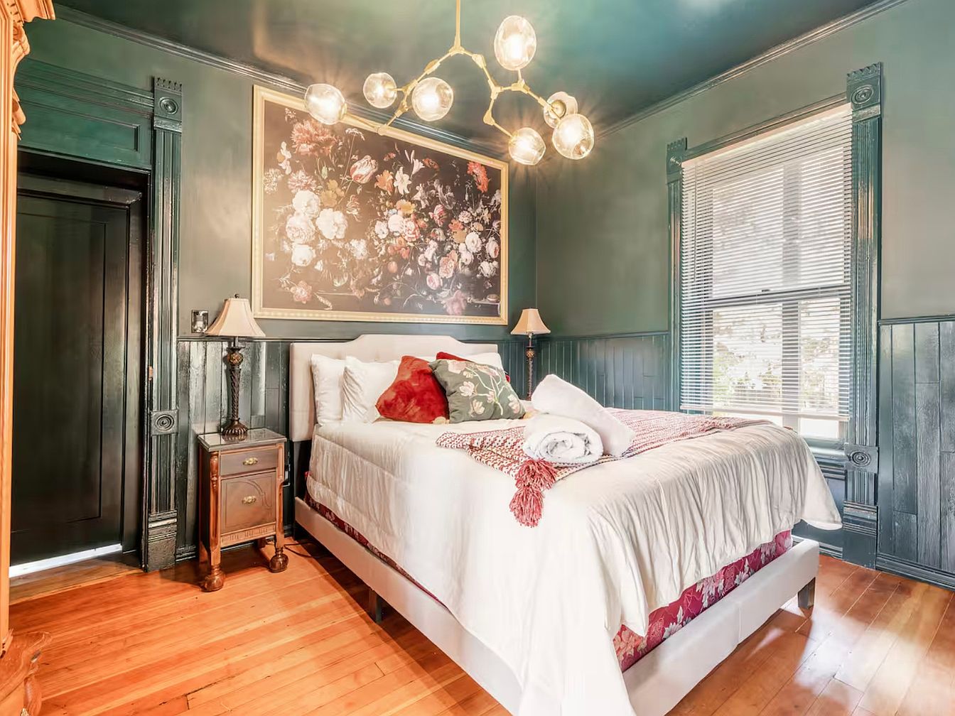 This inviting bedroom combines sophistication with comfort, featuring rich, dark green walls that create a warm atmosphere. The centerpiece is a plush white bed adorned with decorative pillows, providing a striking contrast against the bold color. Elegant wooden flooring enhances the room’s warmth, while a floral artwork above the bed adds a touch of elegance. Side tables with vintage lamps contribute to the cozy ambiance, ensuring a welcoming light for evening reading. Architectural details, such as the intricately carved woodwork and the charming window trim, showcase the home’s character, making this space perfect for relaxation and family gatherings.