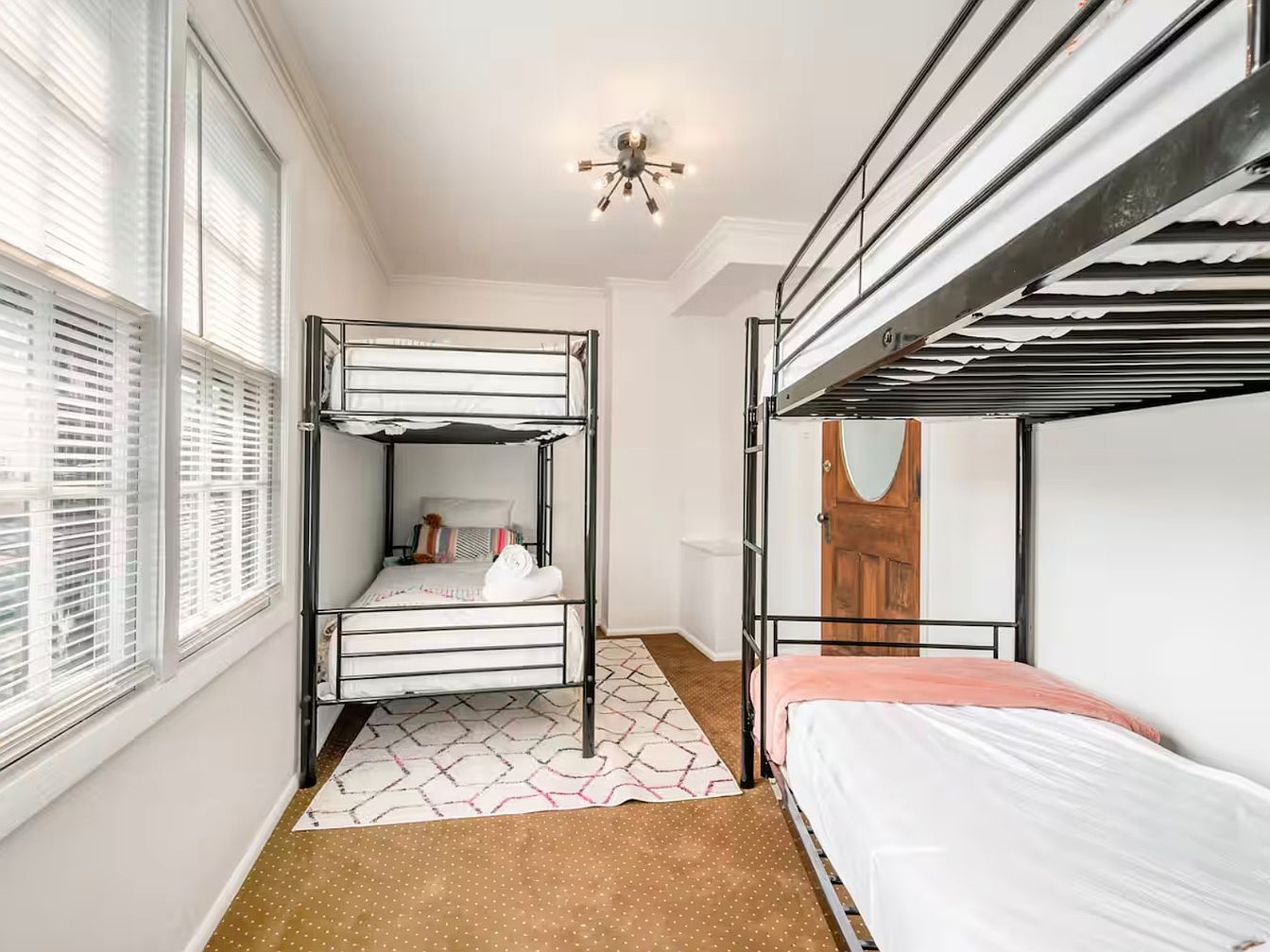 This charming kids’ bedroom features a space-efficient design with stylish bunk beds, perfect for sleepovers and shared rooms. The black metal frames contrast beautifully with the soft, inviting bedding, including a subtle peach accent, fostering a playful yet chic aesthetic. A playful area rug adds warmth to the cozy, carpeted floor, inviting children to play. Natural light streams in through large windows adorned with classic white blinds, creating an airy atmosphere. Family-friendly details, such as accessible charging ports and easy-to-maintain surfaces, cater to the needs of modern living, merging comfort with functionality in a delightful setting.