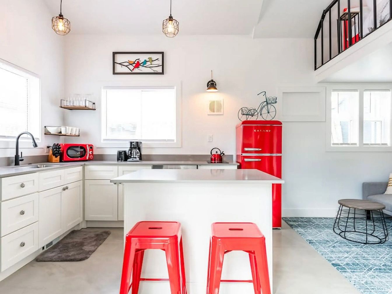 This modern kitchen embraces a vibrant aesthetic with its striking red accents, including a retro-style refrigerator and bar stools that pop against the soft white cabinetry. The layout is open and encourages social interaction, featuring a spacious island ideal for family gatherings. Natural light floods in through large windows, highlighting the sleek stainless steel appliances and minimalist design. A mix of textures, from the smooth countertops to the playful rug, adds warmth and invites comfort. Thoughtful details, like hanging pendant lights and wall art, enhance its charm, making it a perfect blend of functionality and style.