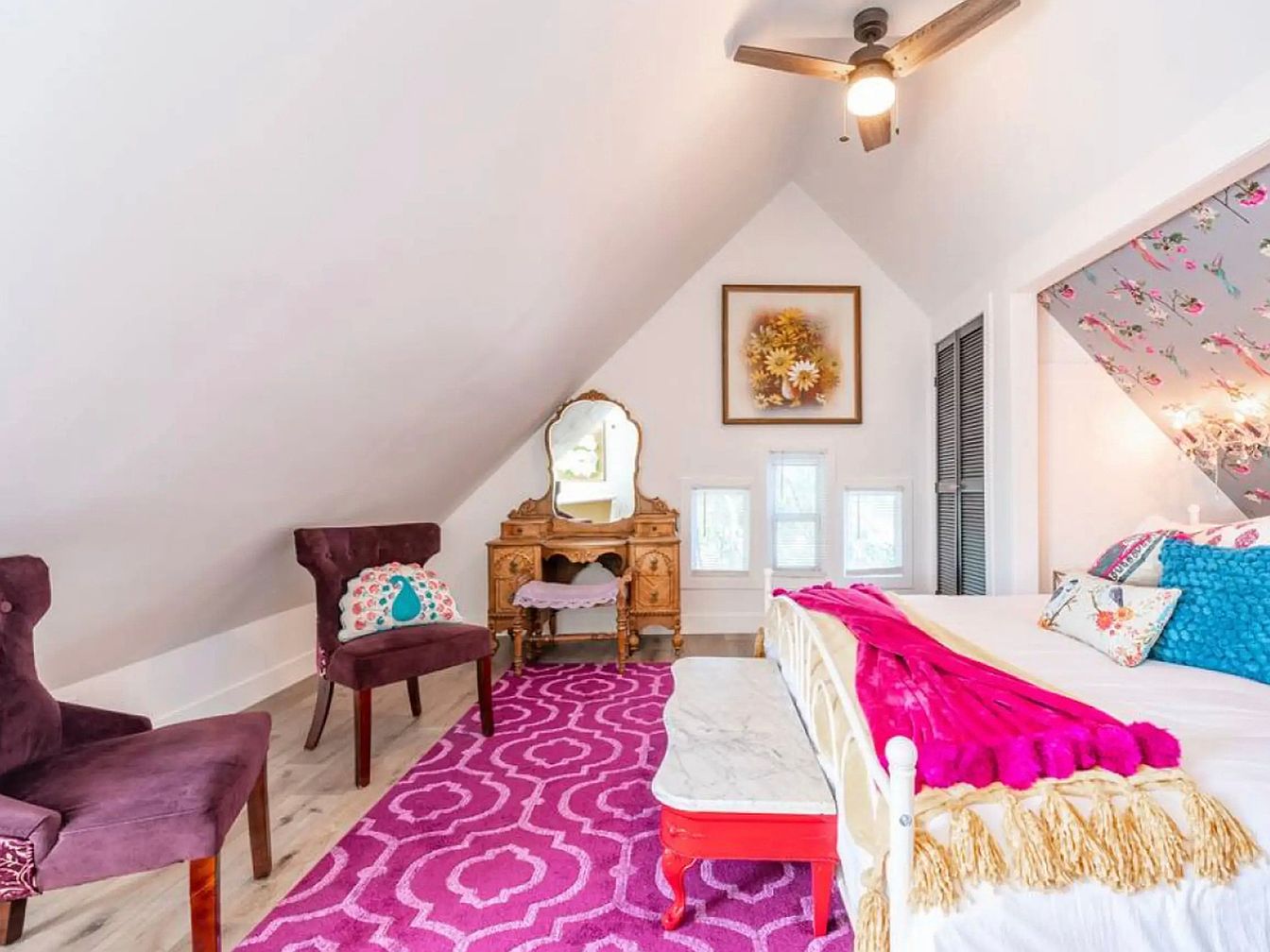This inviting attic bedroom features a cozy atmosphere with its sloped ceiling and charming design. A stunning mix of vibrant colors is on display, highlighted by a rich pink area rug that anchors the space. Two plush, deep purple chairs provide a comfortable seating area, adorned with decorative pillows for added flair. The bed is an elegant focal point, enhanced by colorful throws and accent pillows. An ornate vintage vanity complements the space, accompanied by a framed floral artwork above. Ambient lighting from a rustic ceiling fan adds warmth, making it a delightful family-friendly sanctuary.