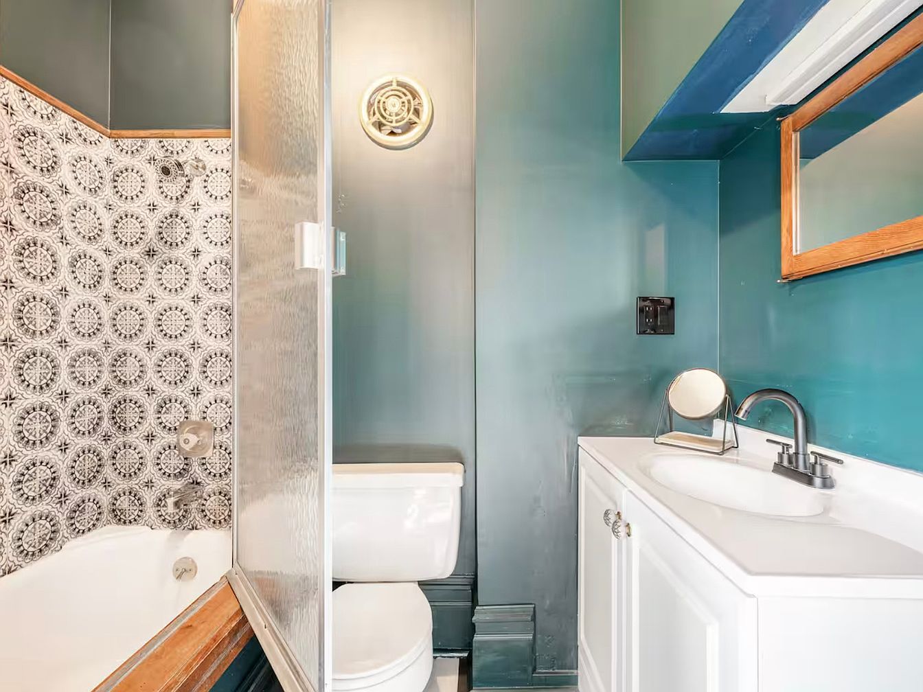 This charming bathroom exudes character with its striking deep teal walls accented by natural wood trim. A blend of modern and traditional aesthetics, the room features a bath/shower combo with an intricate black and white patterned shower curtain, adding visual interest. Bright whites dominate the space with a sleek white vanity and toilet, promoting a clean and airy feel. A circular vintage-style exhaust fan serves as a unique focal point. Thoughtfully designed for family-friendly use, the layout is both practical and inviting, making it a delightful retreat for daily routines.