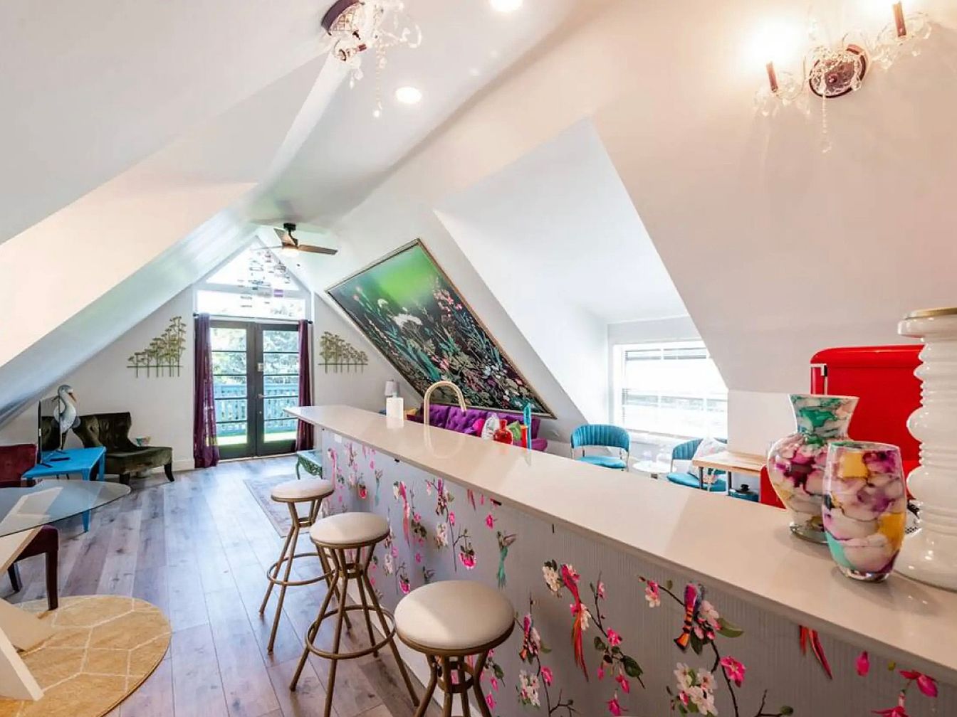 This cozy loft kitchen radiates charm with its sloped ceiling and bright, airy ambiance. The light hardwood flooring creates warmth, enhanced by vibrant floral wallpaper on the bar. A sleek white countertop complements stylish bar stools, inviting friendly gatherings. Bold accents like a retro red refrigerator add a playful touch, while colorful vases and art pieces contribute to the artistic flair. Ample natural light filters through large windows, showcasing a quaint outdoor view. The layout encourages family interaction, with seating areas designed for casual dining and socialization, making it an ideal space for both culinary adventures and relaxation.
