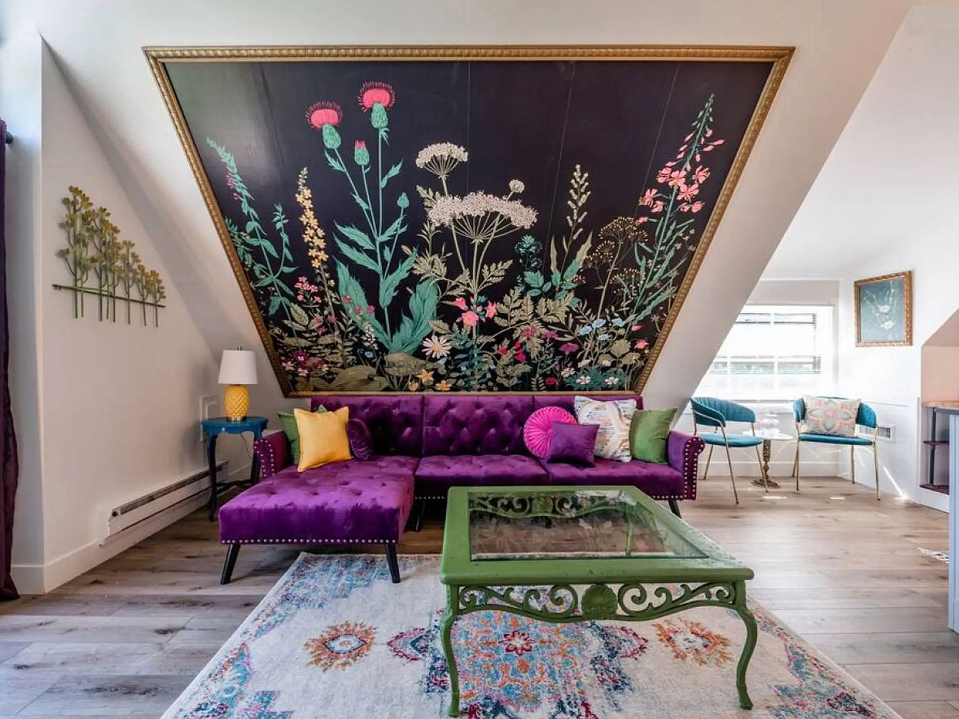 This vibrant living room is a celebration of color and creative design. A stunning floral mural adorns the angled wall, providing a striking backdrop for the rich purple velvet sectional adorned with assorted cushions in playful hues. The green coffee table adds a touch of whimsy and contrasts beautifully with the warm wood flooring. A playful arrangement of modern chairs and a welcoming lamp enhances the space, making it ideal for family gatherings and cozy evenings. Soft light filters through the windows, accentuating the eclectic blend of textures and styles that invite comfort and conversation in this family-friendly environment.
