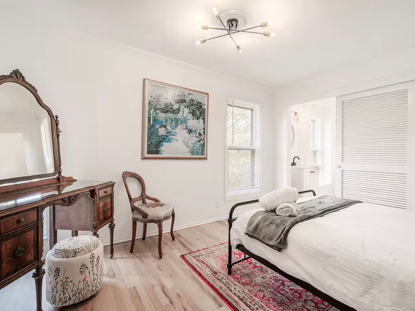A serene guest bedroom designed for comfort and relaxation, featuring a minimalist layout with a soft color palette. The bed is adorned with plush linens and a stylish throw, creating an inviting atmosphere. A vintage-style dresser and elegant chair add a touch of sophistication, while the floral accent on the stool introduces a pop of color. Natural light floods through large windows, enhanced by light wooden flooring that complements the room’s airy feel. Architectural details, such as the modern light fixture and artwork, infuse personality, making this space perfect for family or friends seeking a tranquil retreat.