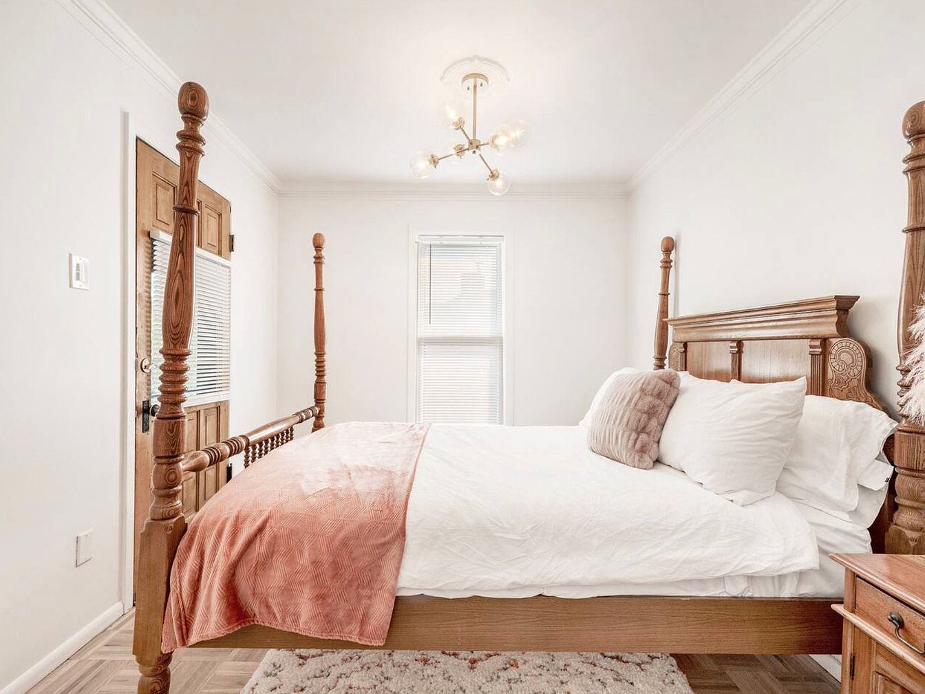 This inviting master bedroom features a charming, vintage wooden poster bed, exuding a warm and welcoming ambiance. Natural light streams through the elegantly framed window, enhancing the space’s brightness. A soft, blush quilt gracefully drapes over crisp white sheets, adding a touch of color without overwhelming the serene palette. Light hardwood flooring complements the rustic character of the room, while a plush area rug offers both comfort and style underfoot. Architectural details like crown molding and a statement chandelier enhance the room’s charm. A sturdy wooden door provides an entrance, blending traditional craftsmanship with modern convenience, ideal for any family.