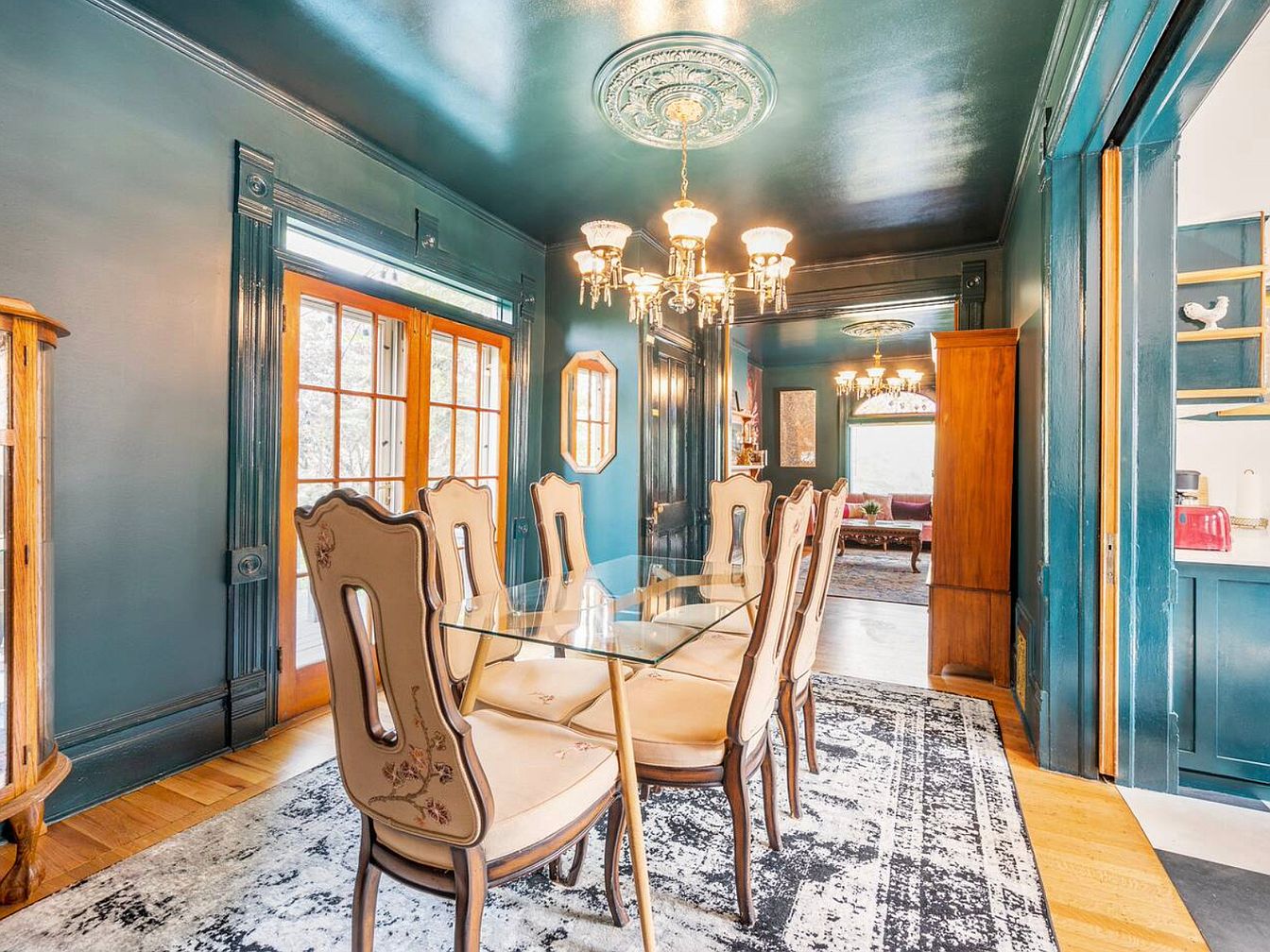 A beautifully appointed dining room exuding sophistication and warmth. Rich teal walls contrast elegantly with golden fixtures and intricate crown moldings, creating a timeless ambiance. The transparent glass table paired with upholstered chairs offers a touch of modernity while maintaining classic charm. Natural light floods the space through double French doors, accentuating the craftsmanship in the woodwork and decorative details. Plush area rugs enhance the comfort, making it a welcoming spot for family gatherings. Adjacent, a glimpse of the inviting living area reveals seamless connectivity, emphasizing the home’s family-friendly design, ideal for both entertaining and everyday use.
