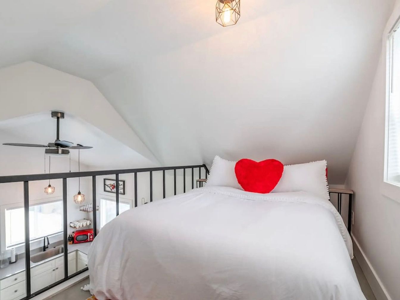 This charming loft bedroom optimizes the space with its cozy, inviting design. The sloped ceiling adds architectural interest, complemented by crisp white walls that enhance the bright, airy atmosphere. A plush bed showcases a playful heart-shaped pillow, introducing a touch of warmth and whimsy. The minimalist railing allows for an open feel while providing safety on the upper level. Below, glimpses of the kitchen with sleek cabinetry and modern appliances create a family-friendly environment, perfect for gatherings. Soft pendant lights add a warm glow, ensuring this loft serves as a serene retreat, combining style and comfort beautifully.