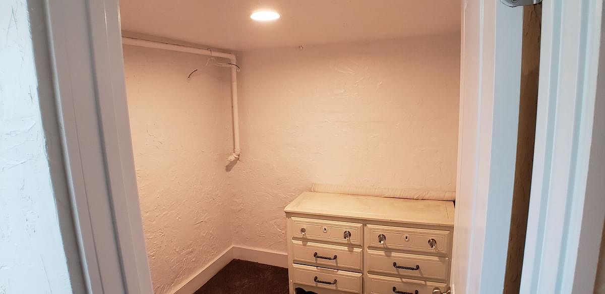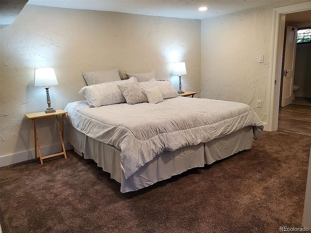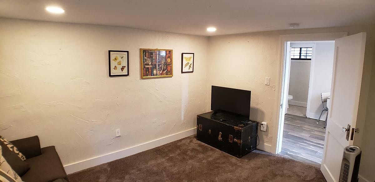 This inviting living area features a soft, plush carpet that enhances comfort, creating a welcoming atmosphere. Light-colored walls contrast beautifully with the darker hues of the furniture, providing a serene backdrop. A collection of framed artwork adds a personal touch, while a compact television sits atop an antique trunk, doubling as stylish storage. Ample recessed lighting brightens the room, ensuring a cozy feel at any hour. A doorway leads to additional private spaces, showcasing thoughtful accessibility. Ideal for family gatherings or quiet relaxation, this room blends modern convenience with warmth and charm.