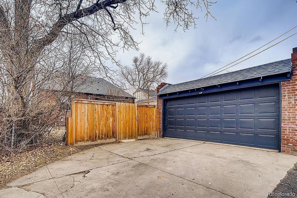 This garage entryway blends functionality with aesthetic appeal, offering a spacious concrete area leading to a large, dark blue garage door that enhances contemporary charm. The sturdy wooden fencing frames the entrance, providing a sense of privacy while adding warmth through its natural wood tones. Surrounding trees add a touch of nature, creating a serene ambiance. The clean lines of the architectural design cater to a modern lifestyle, while the ample parking space is ideal for families. This well-maintained area showcases the perfect balance of utility and style, inviting homeowners to enjoy convenience without compromising appearance.