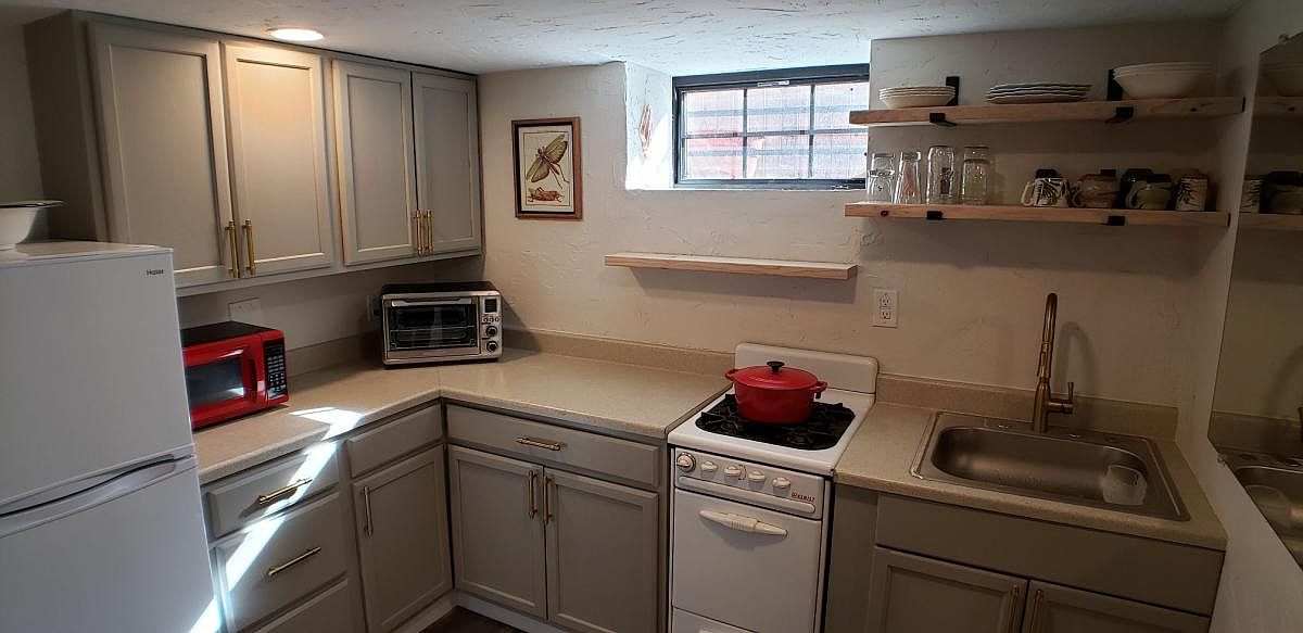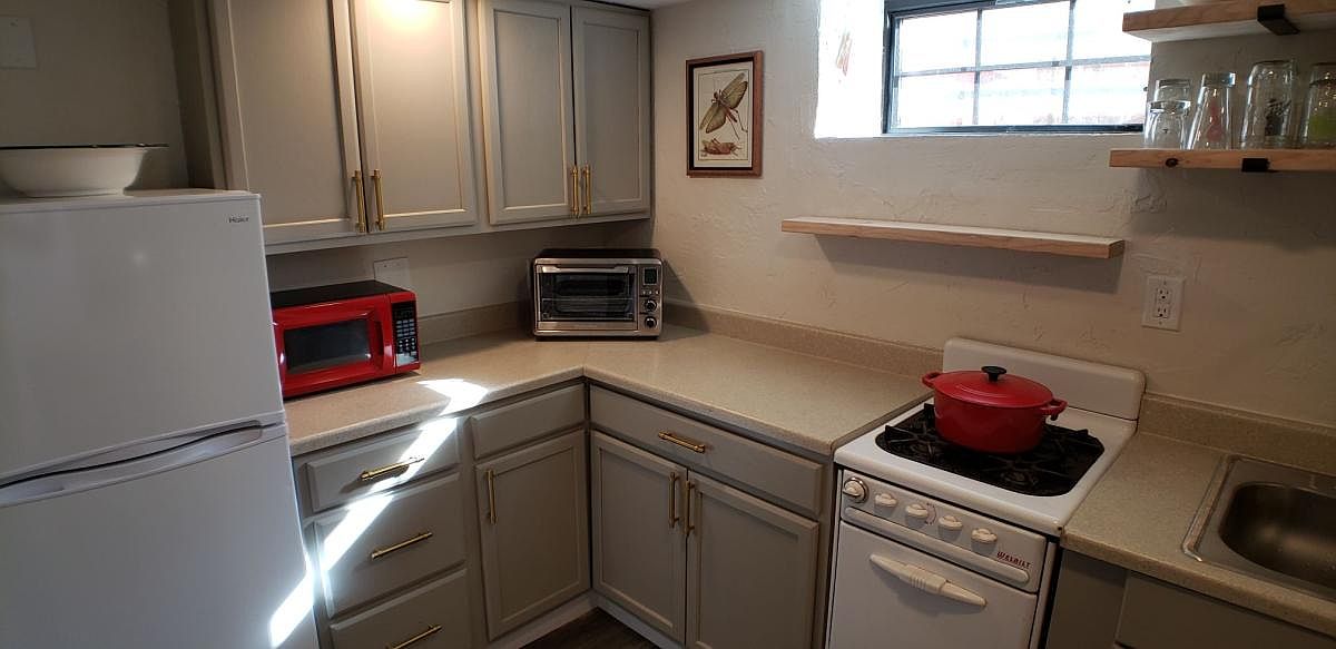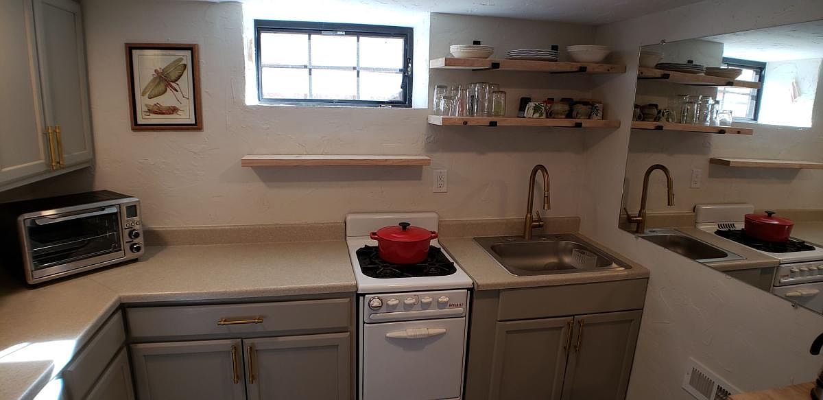 This charming kitchen combines functionality with warmth, making it a delightful space for family gatherings. The layout features a well-defined corner, maximizing counter space and storage with sleek grey cabinetry adorned with elegant gold handles. A large window bathes the area in natural light, enhancing the inviting atmosphere. Key appliances, like a contrasting red microwave and a traditional white stove, offer modern convenience amidst classic styling. The countertop, spacious and easy to clean, invites culinary creativity. A wooden shelf adds rustic flair, perfect for displaying decorative pieces, contributing to the home’s cozy, welcoming ambiance.